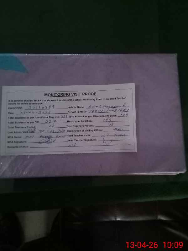 | Remarks (Use Separate Page if Required): Students Attendance Registers are being update School playground required cleanliness and maintenance Data as per provided by School Staff and found during physical visit | |||||