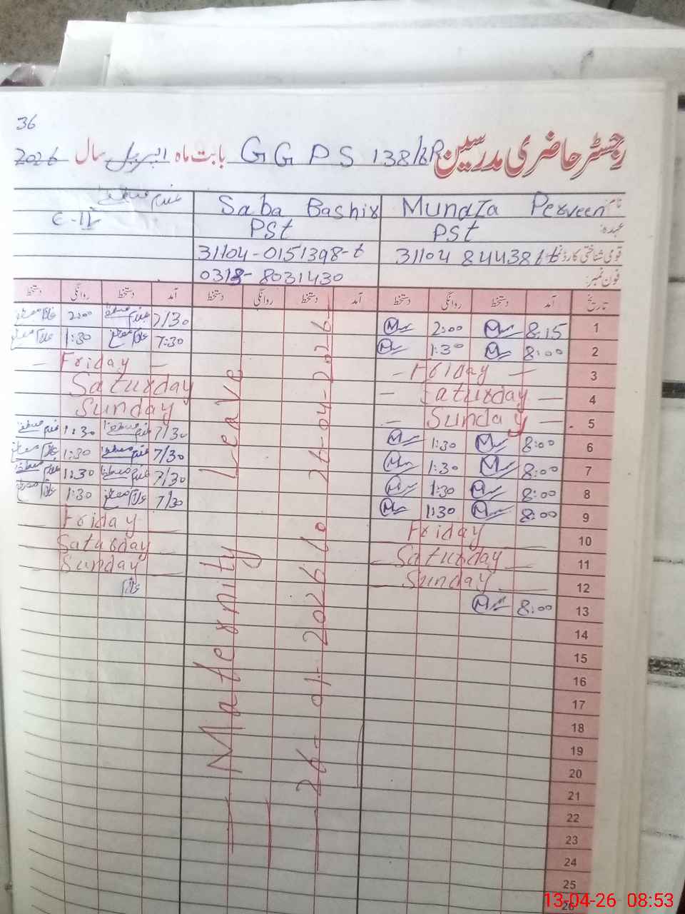| Remarks (Use Separate Page if Required): pst Saba Bashir is absent as marked in maternity leave without online approved | |||||
