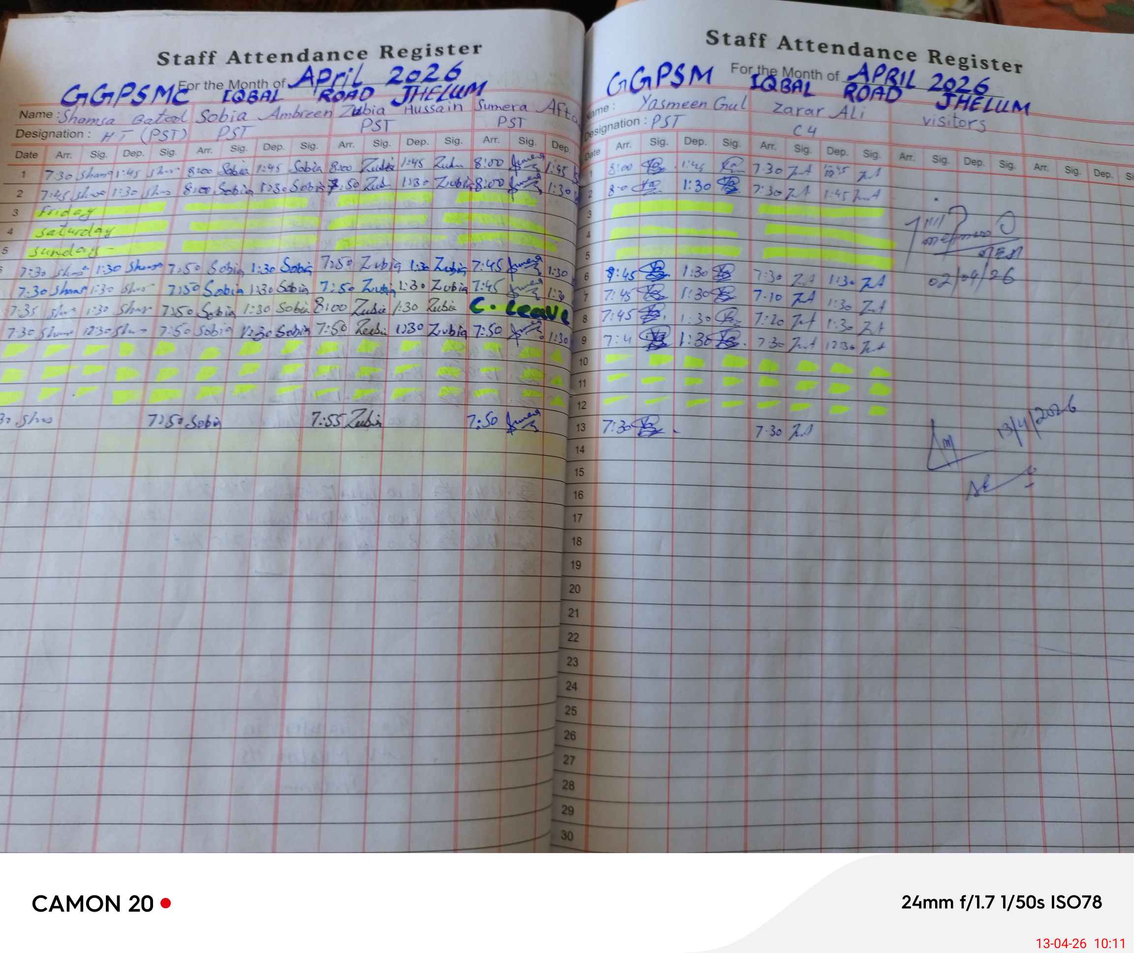| CNIC | Full Name | Designation | R/C | Absence During Last Calender Month |