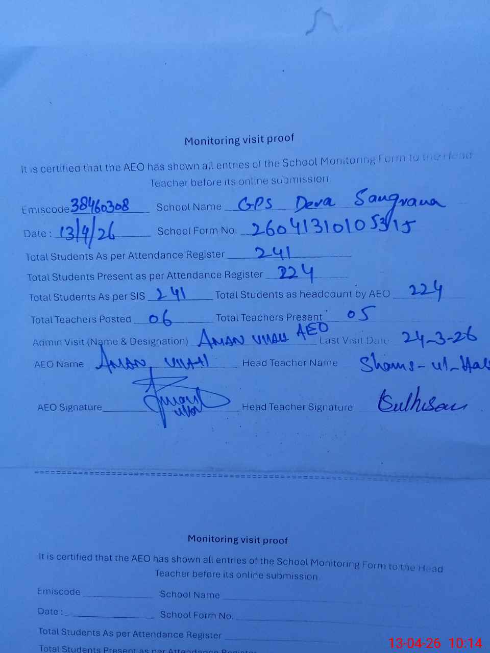| Certified that this School was Inspected by the Undersigned MEA/DMO Today and the Information Stated Above is as Per Record. | |||||