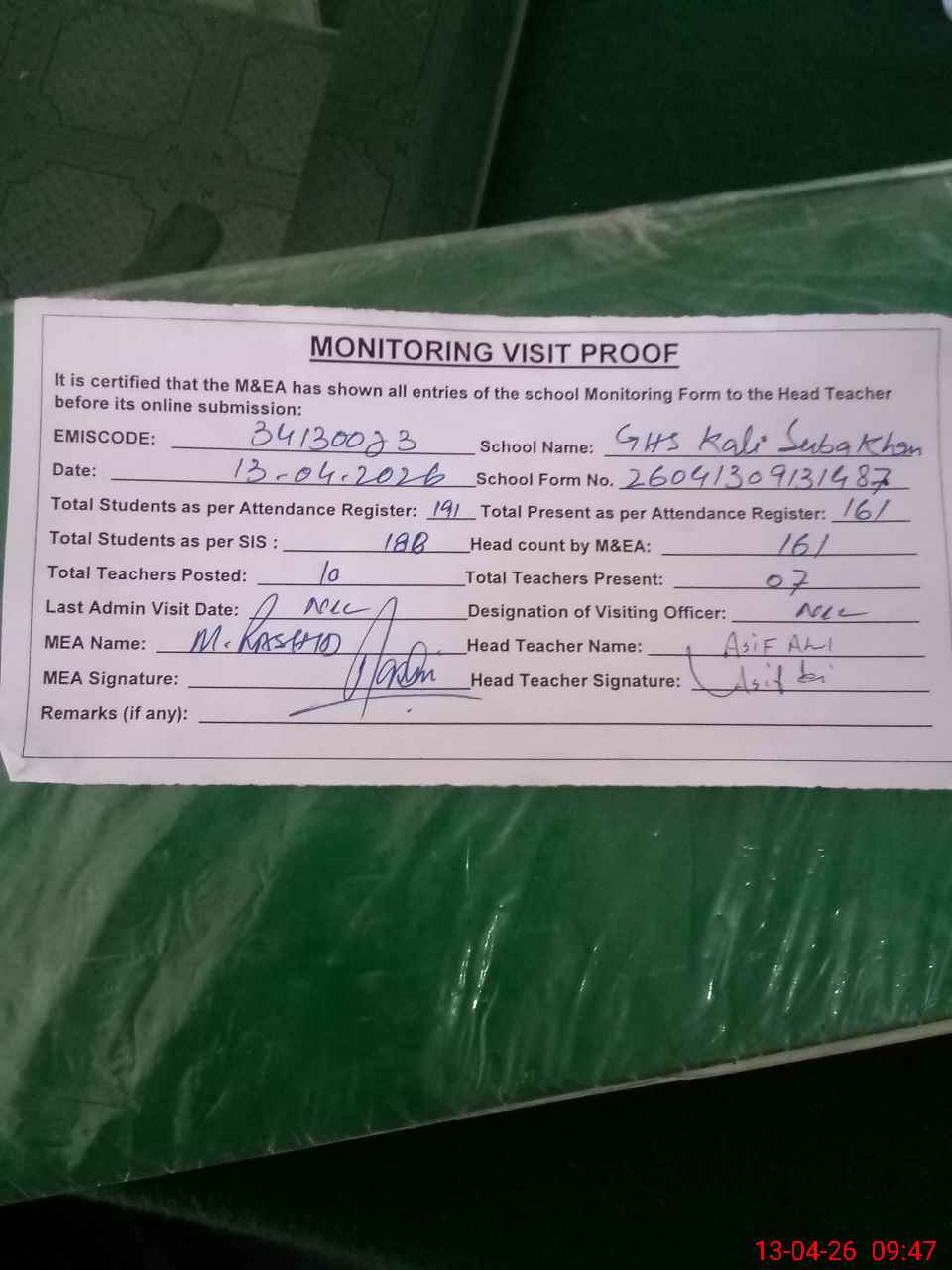 | EMIS Code: 34130023 | Name of School: GHS KALI SOBA KHAN | |||