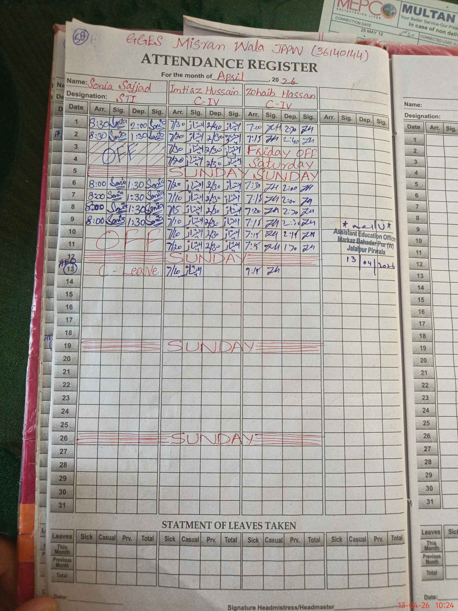 | 36**** | Fo**** Sa**** | PST Arts | Regular | 0 | 0 | 0 | 0 | 0 | 0 | 0 | 0 | 0 | Absent (Un-Authorized) |