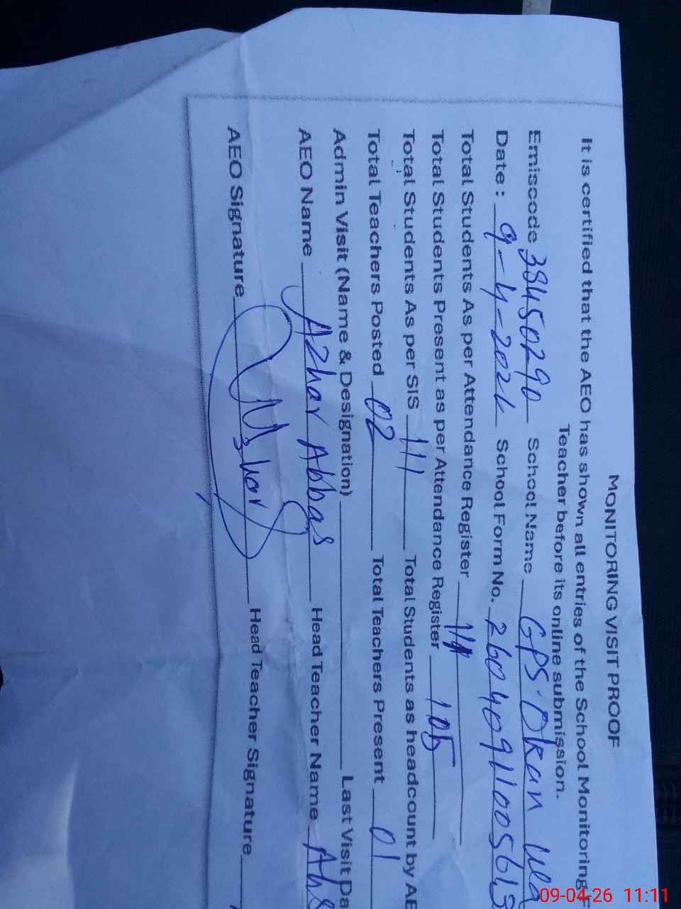 | Certified that this School was Inspected by the Undersigned MEA/DMO Today and the Information Stated Above is as Per Record. | |||||