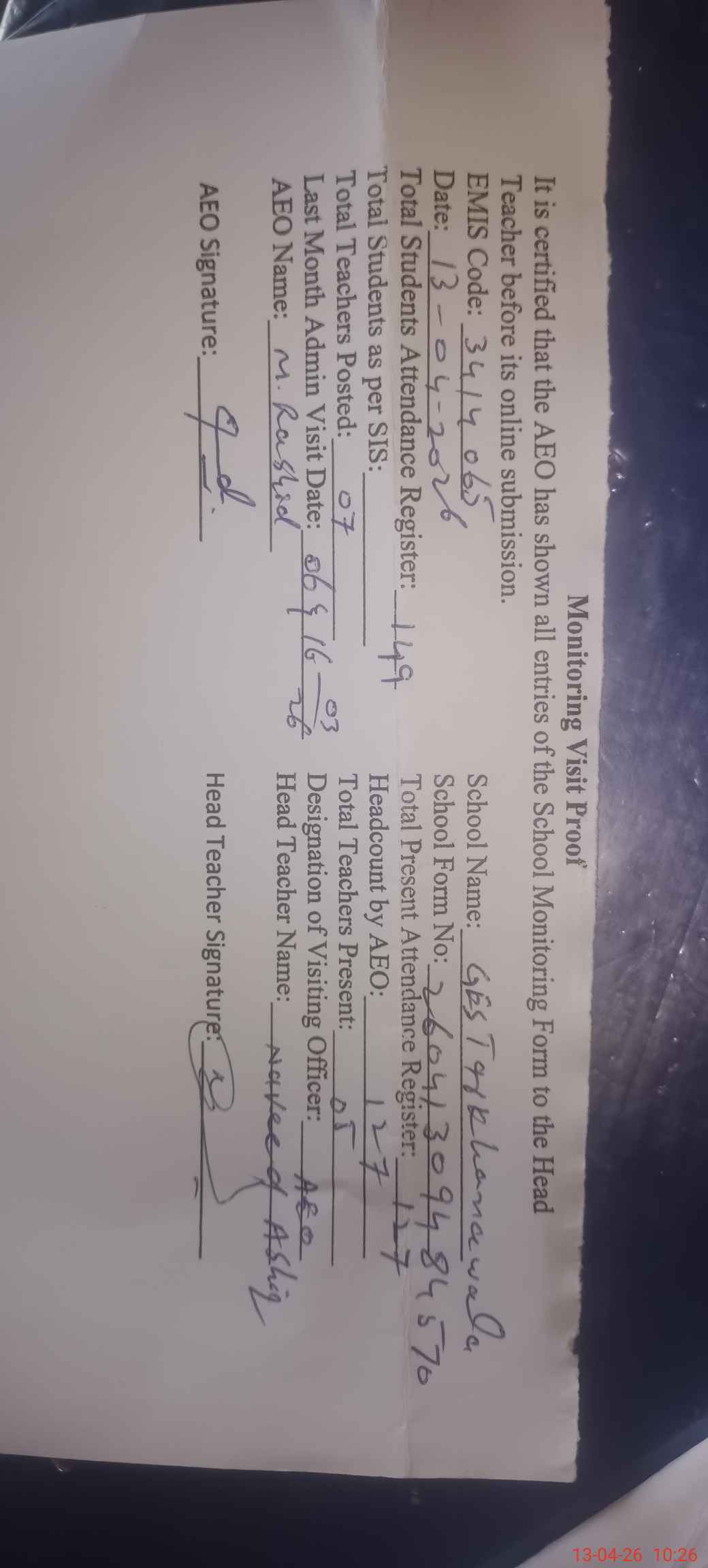 | EMIS Code: 34140165 | Name of School: GES TARKHANA WALA | |||