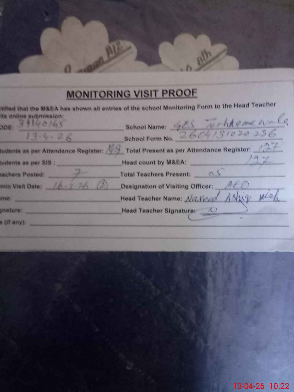 | Attendance Register | Head Teacher | MEA with School | Visit Proof |