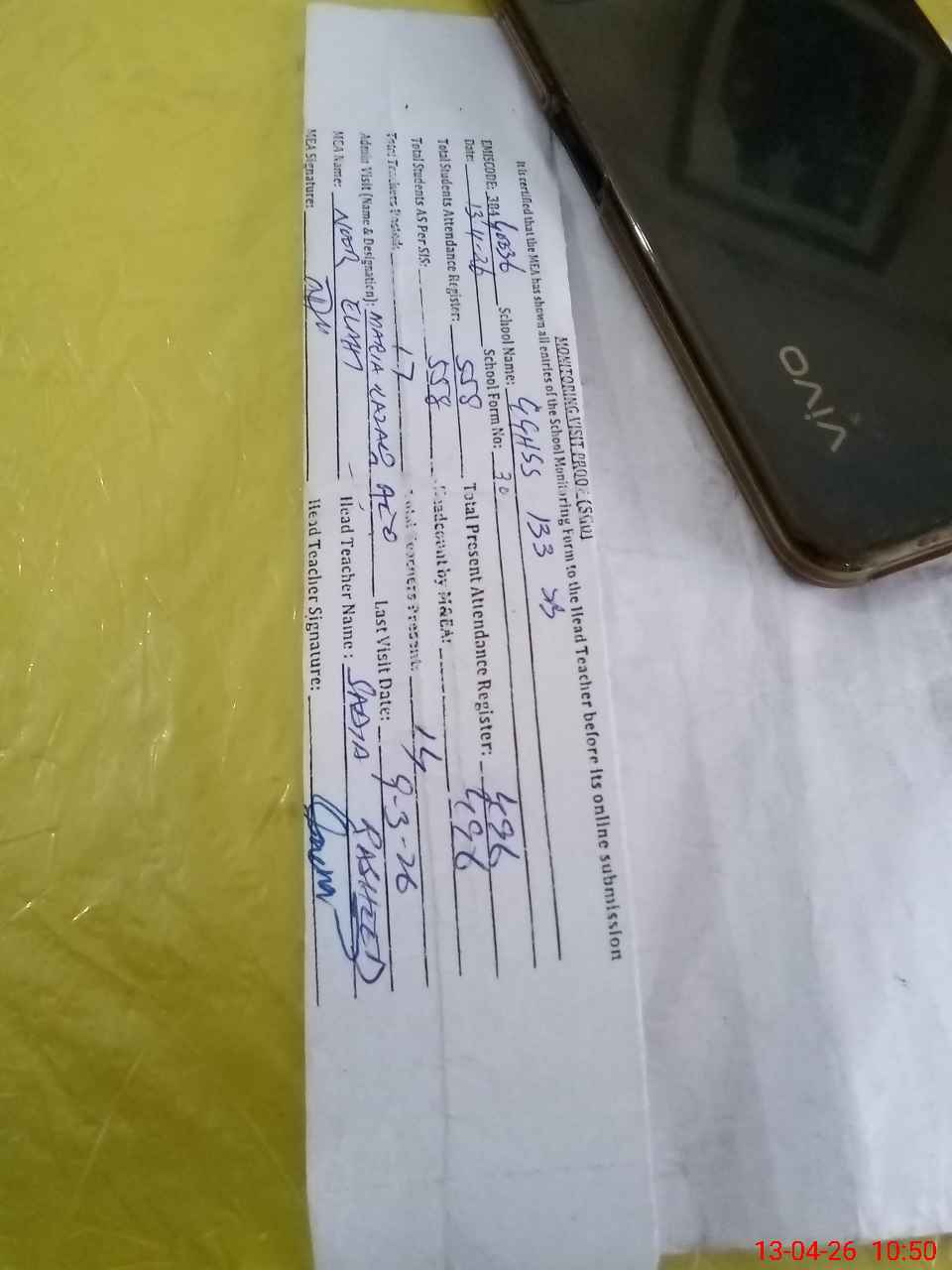 | Attendance Register | Head Teacher | MEA with School | Visit Proof |