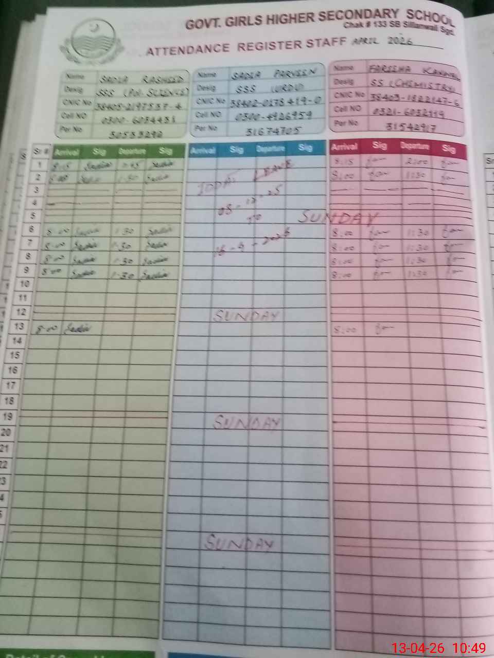 | CNIC | Full Name | Designation | R/C | Absence During Last Calender Month |