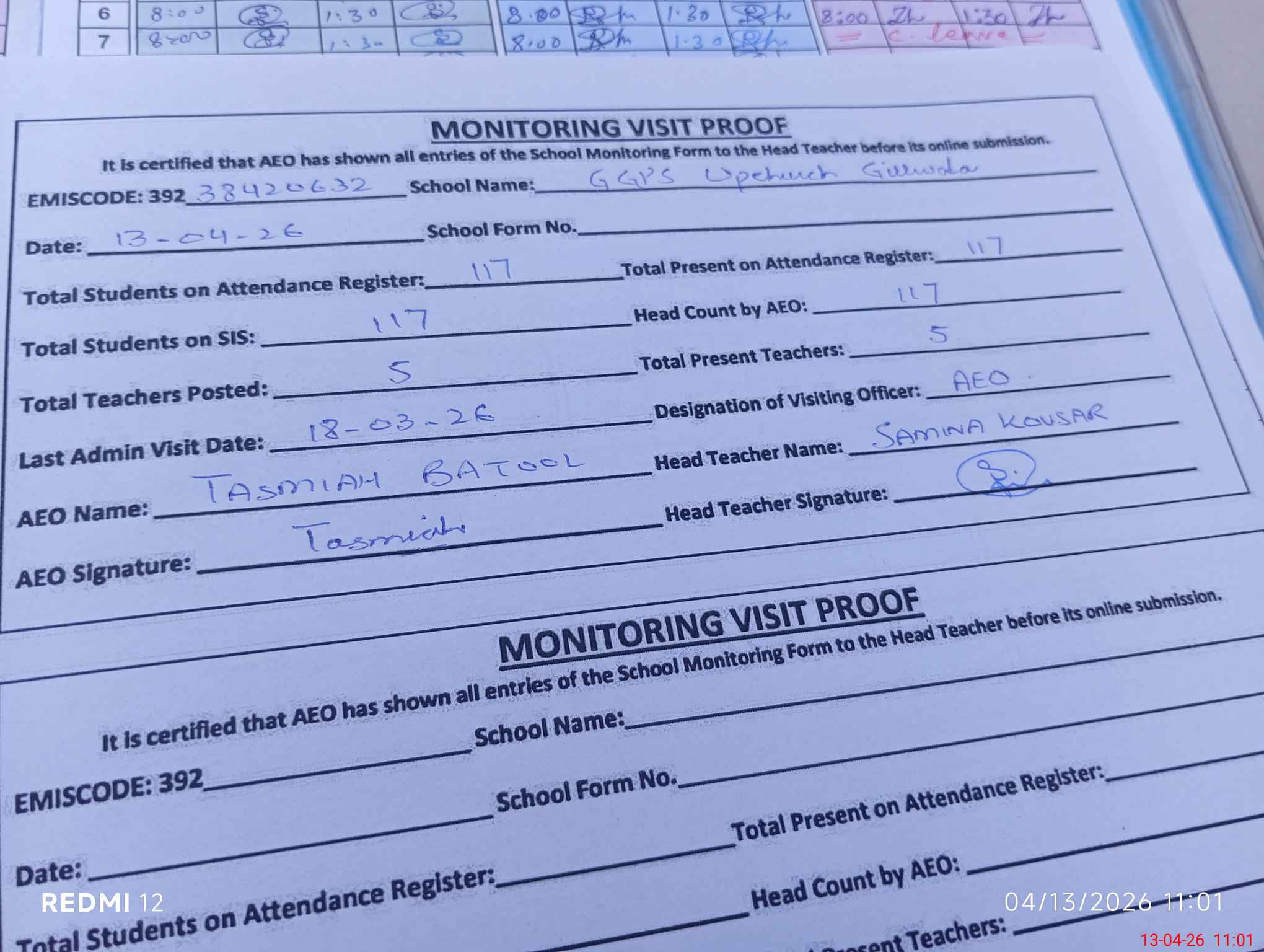 | Attendance Register | Head Teacher | MEA with School | Visit Proof |