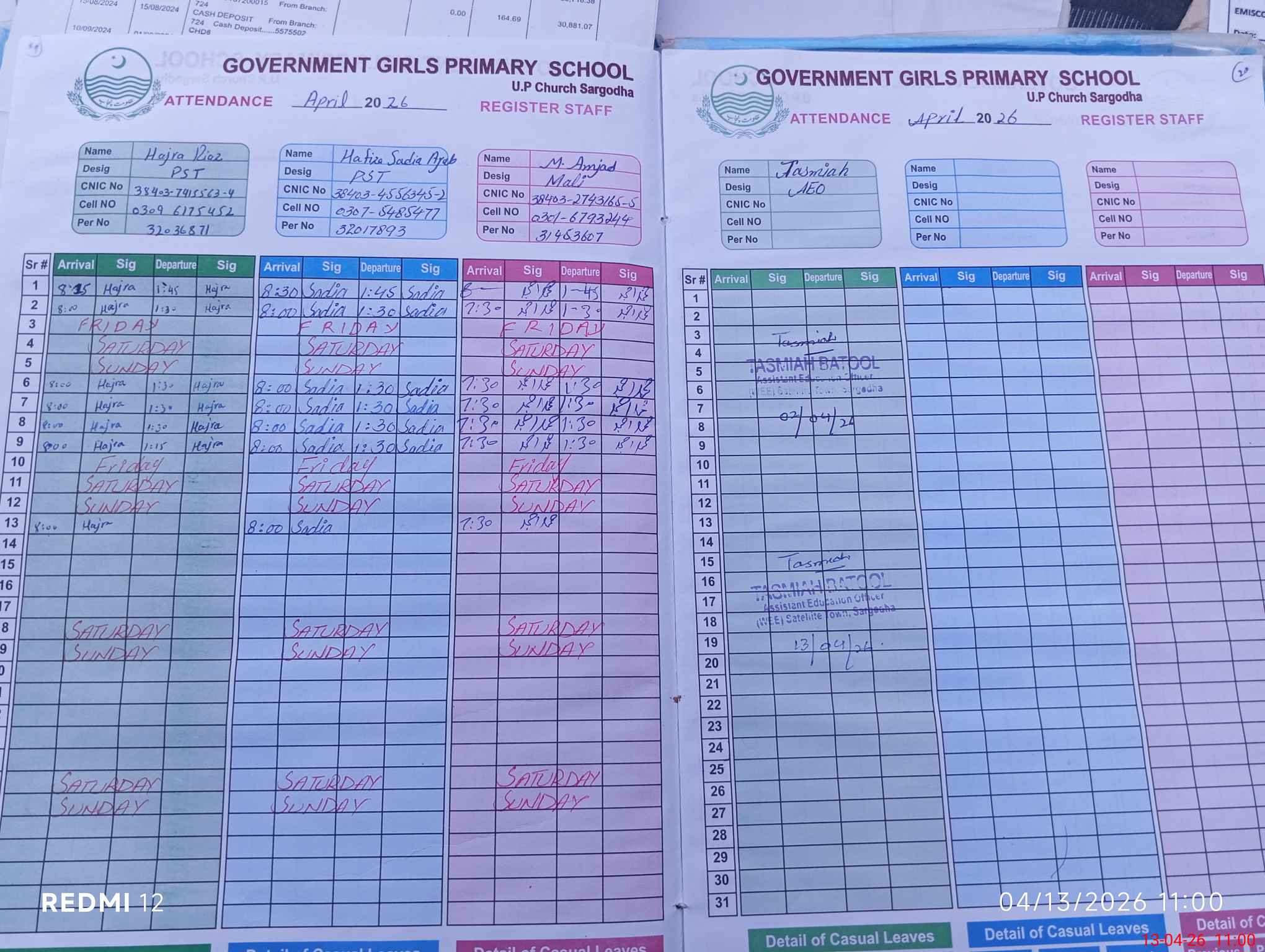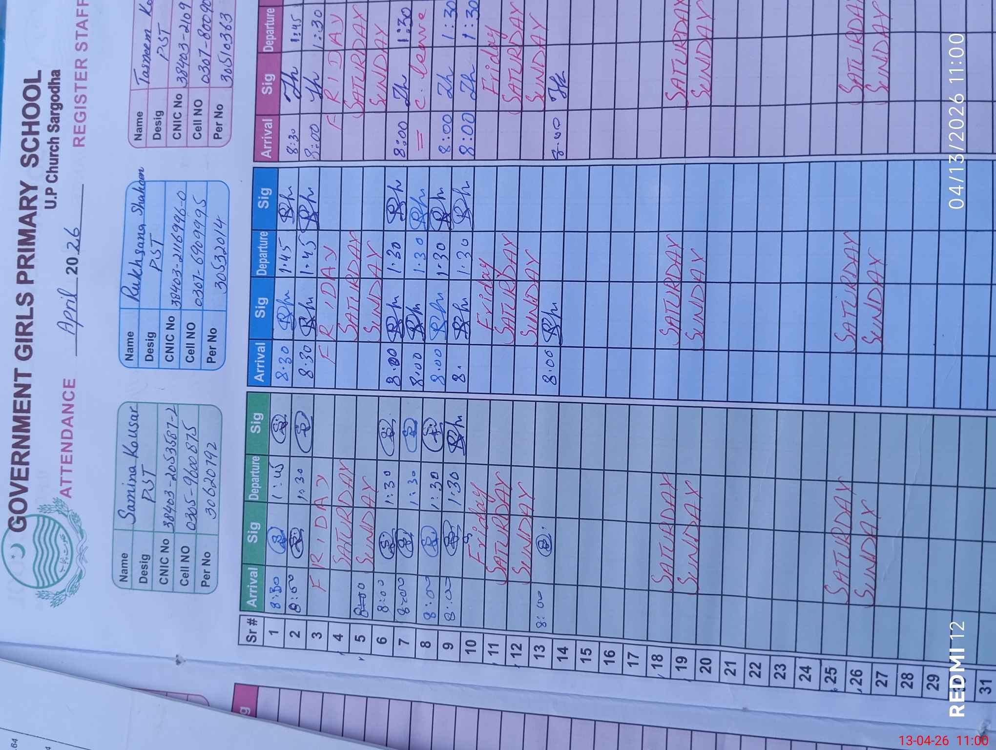 | CNIC | Full Name | Designation | R/C | Absence During Last Calender Month |