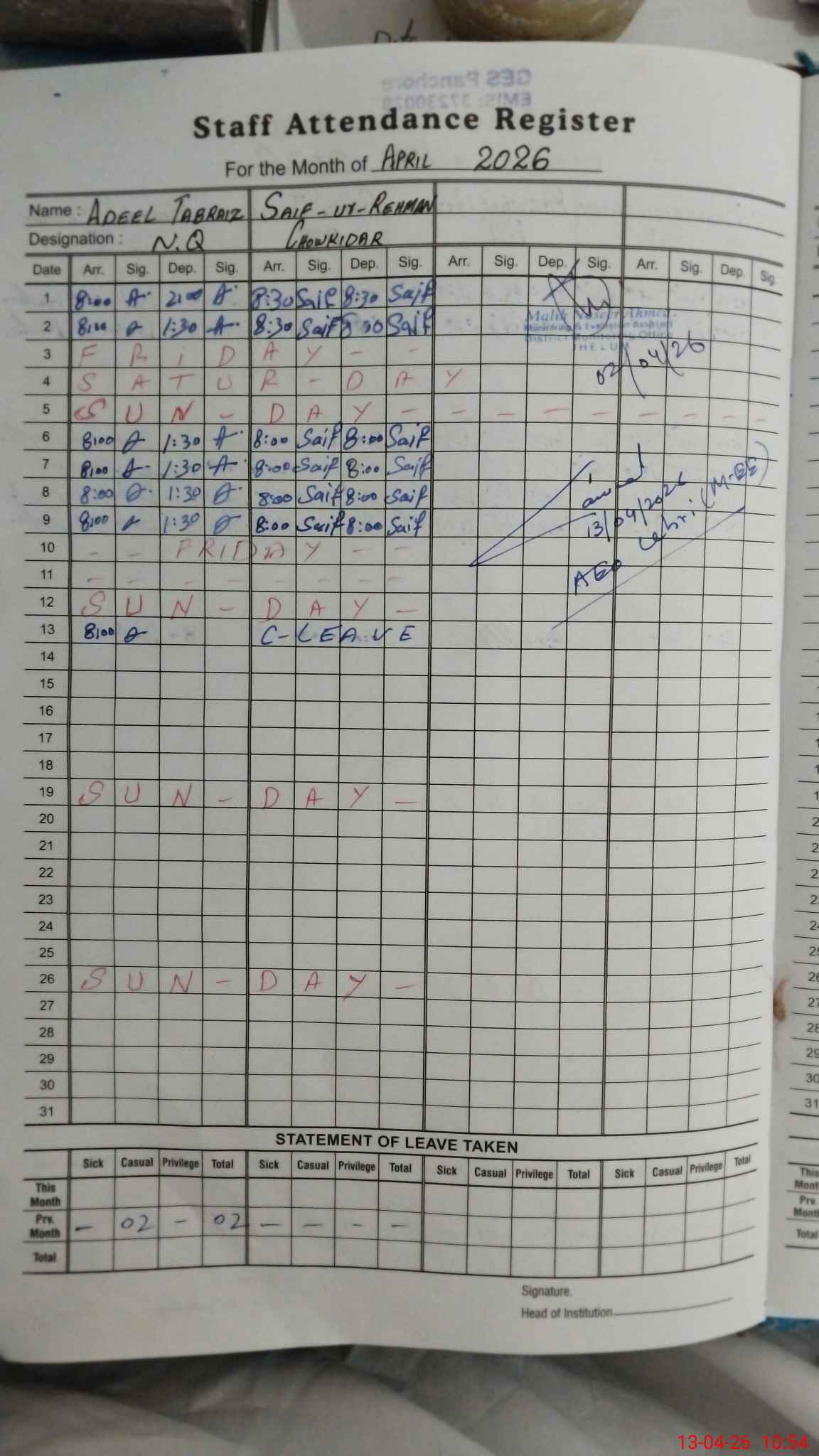 | 37**** | Sa**** UrRe**** | CHOWKIDAR | Regular | 0 | 0 | 0 | 0 | 0 | 0 | 0 | 0 | 0 | Casual |