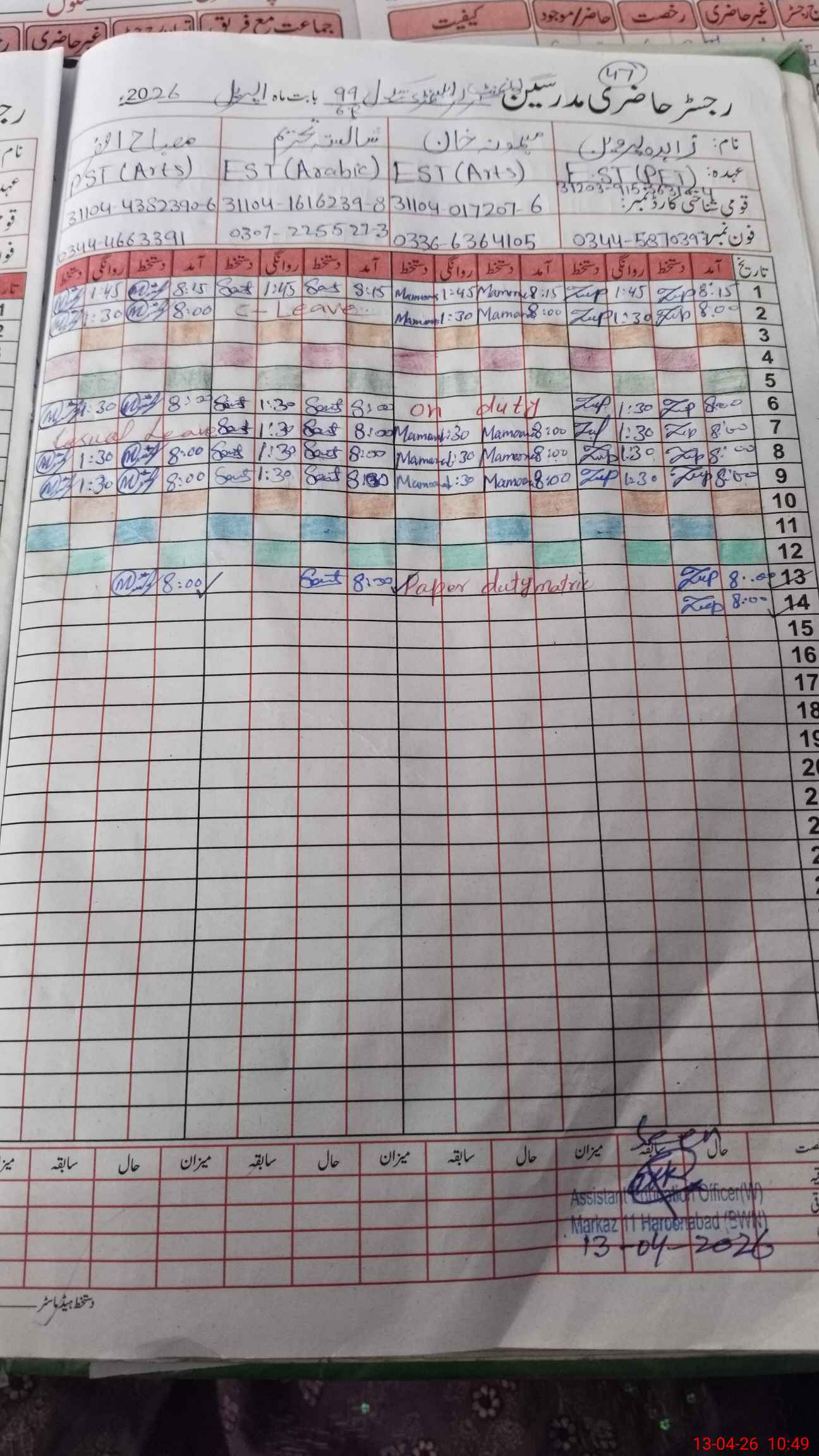 | 31**** | Ma**** Kh**** | EST General Arts | Regular | 0 | 0 | 0 | 0 | 0 | 0 | 0 | 0 | 0 | Exam Duty |