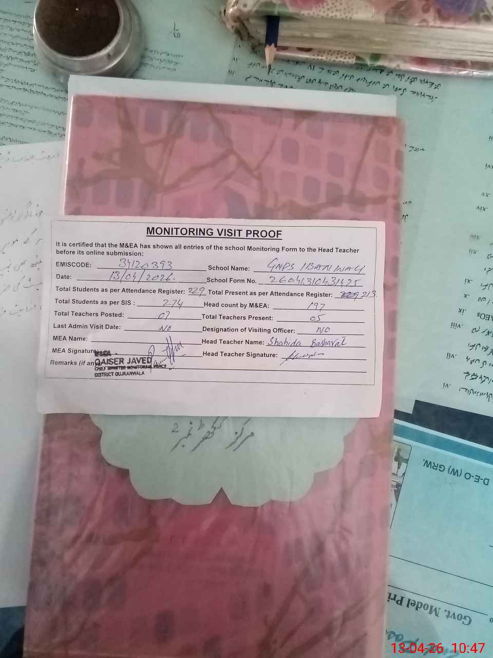 | Attendance Register | Head Teacher | MEA with School | Visit Proof |