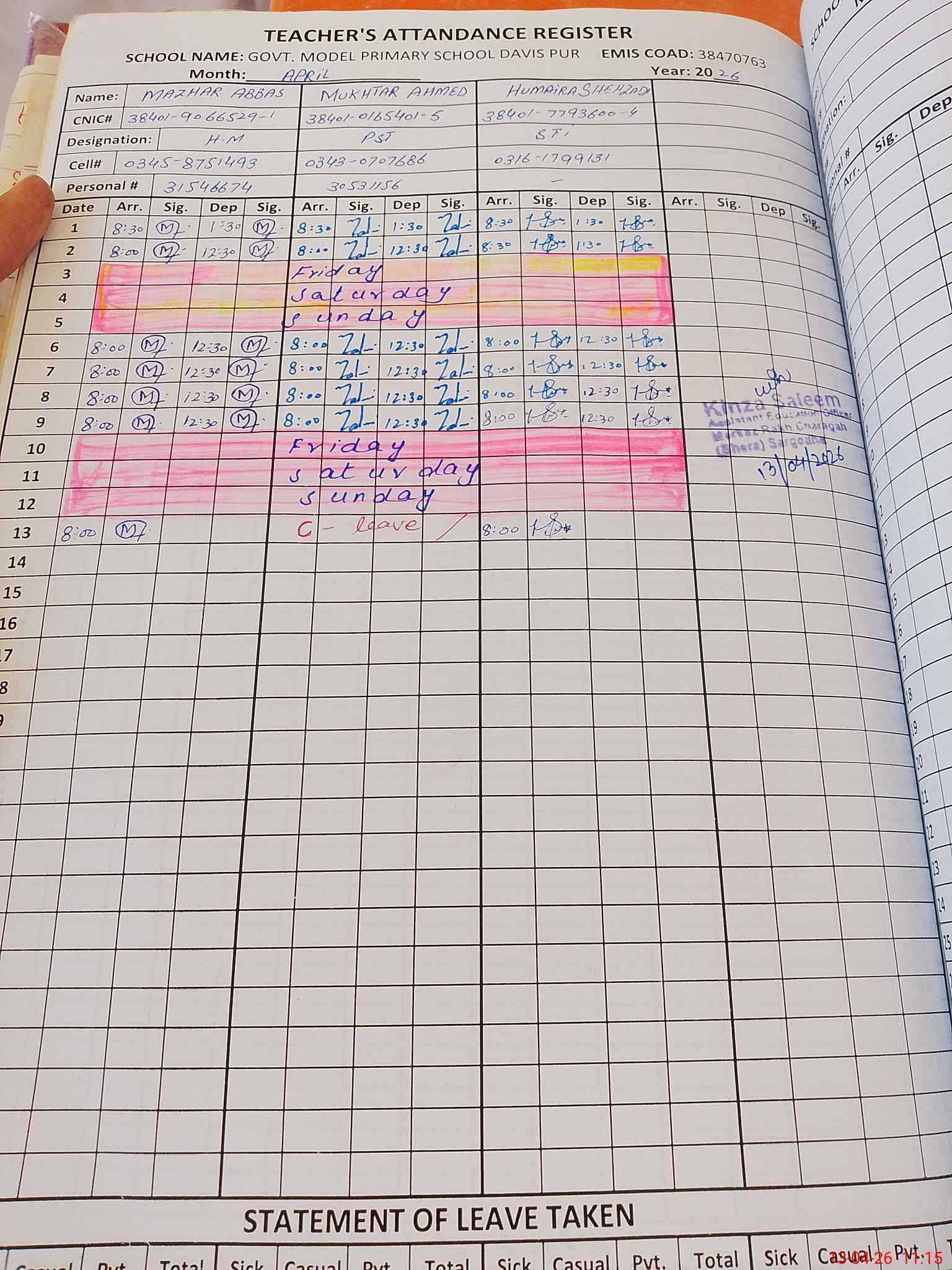 | Name: MA**** AB**** Designation: (School Headmaster's/Headmistress's) PST Phone/Cell Number: 03**** |