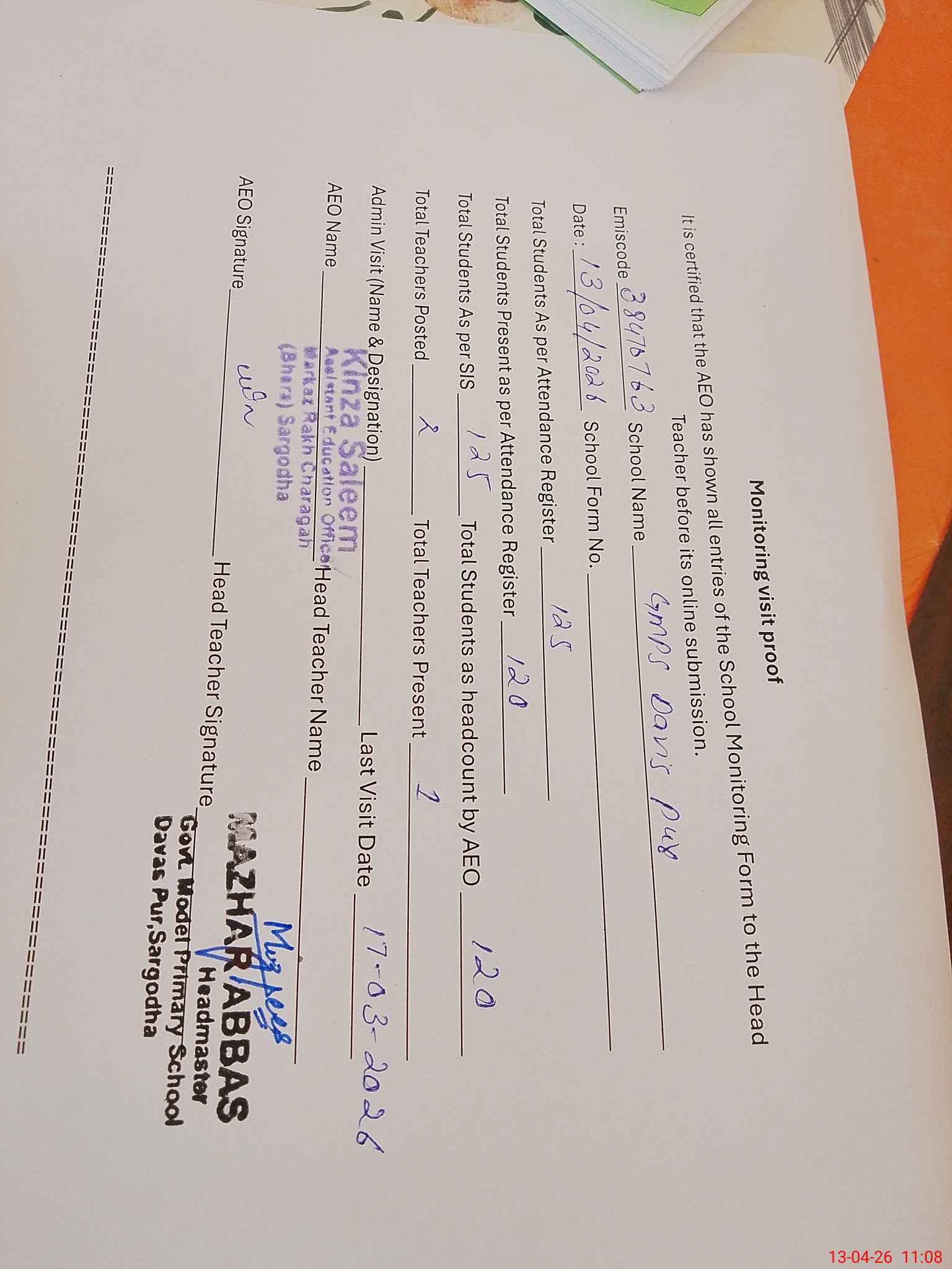 | Attendance Register | Head Teacher | MEA with School | Visit Proof |