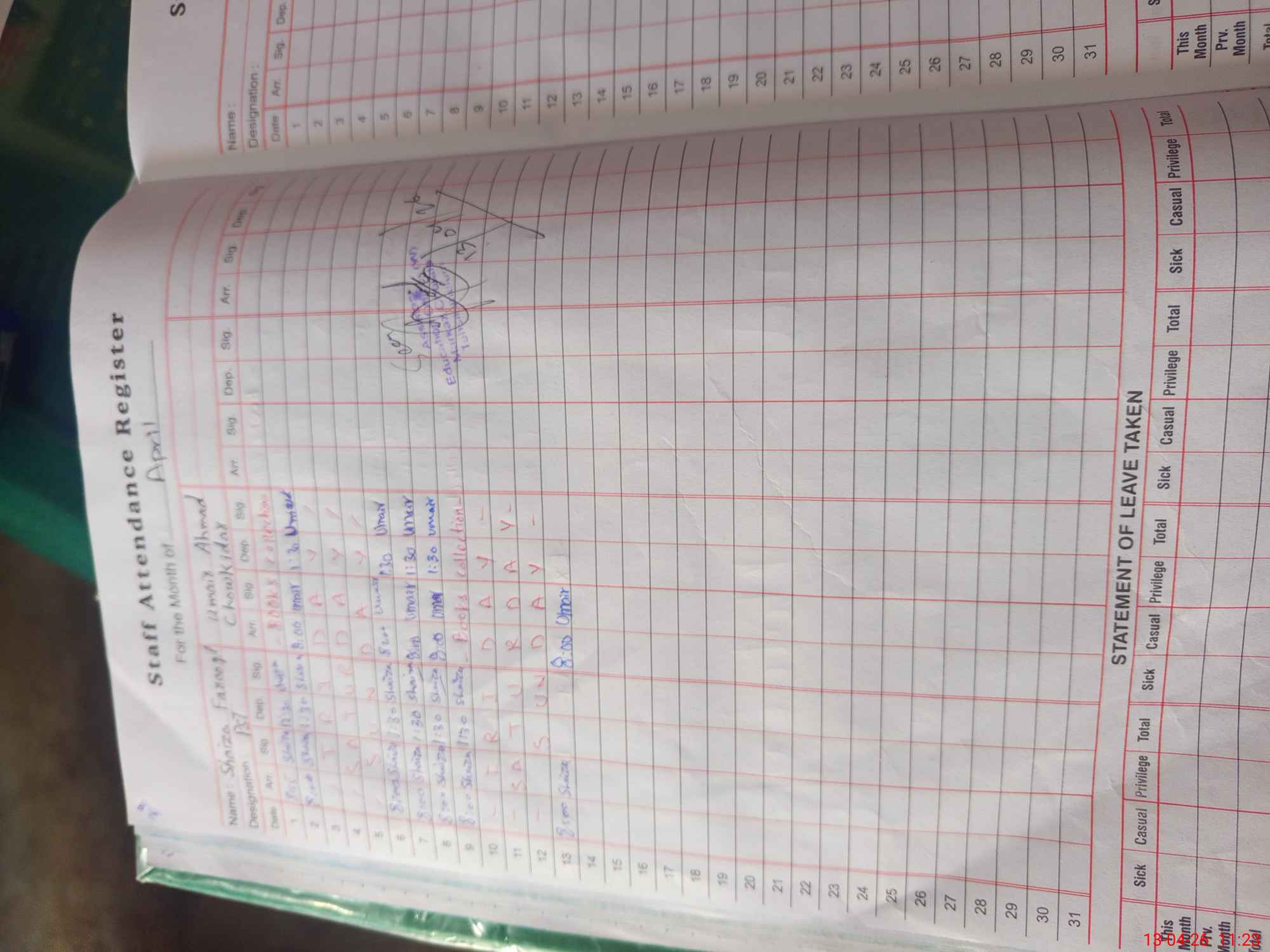 | Leave | Duty | Absent | Maternity | Medical | Ex- Pak |