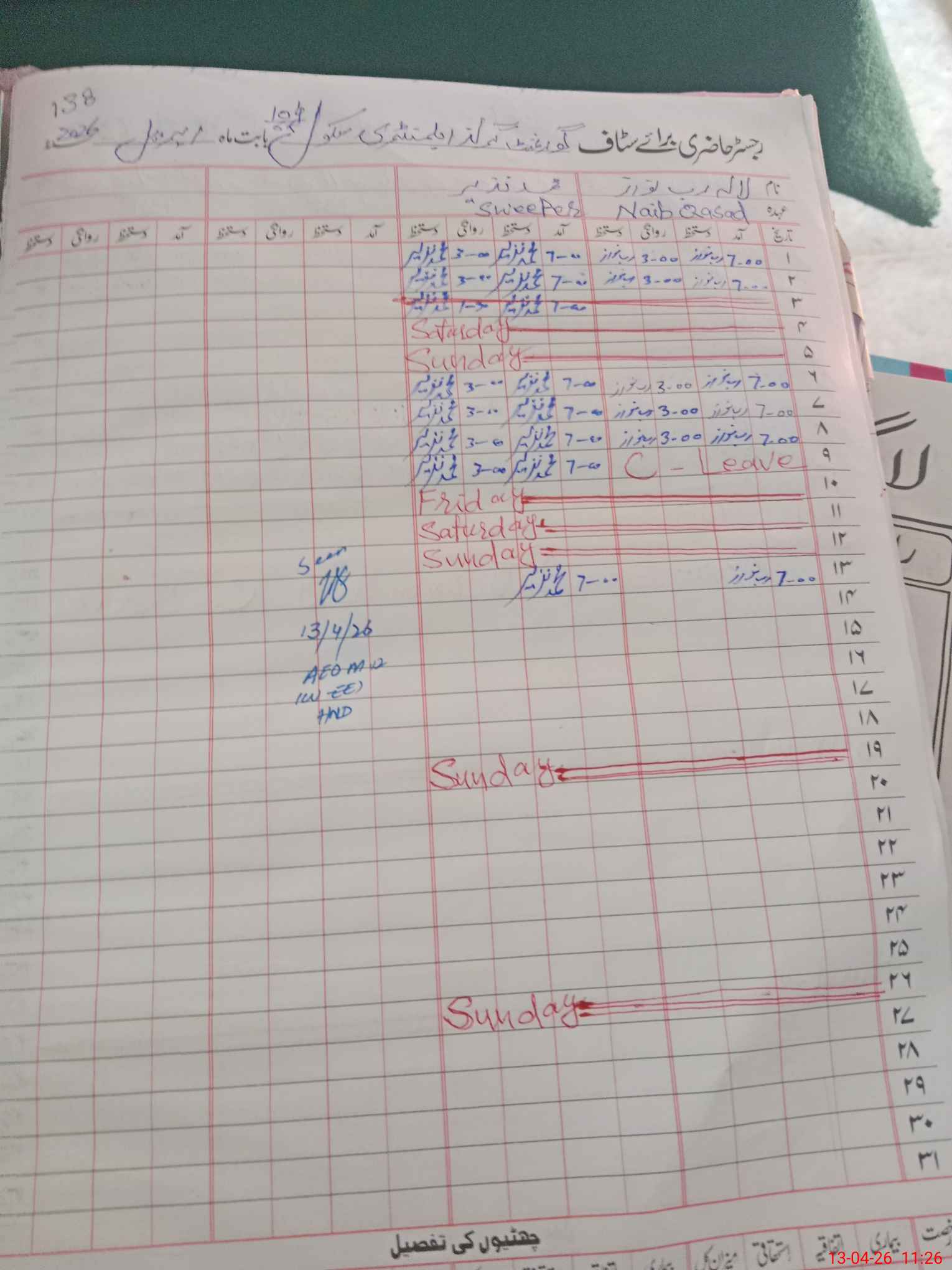 | CNIC | Full Name | Designation | R/C | Absence During Last Calender Month |
