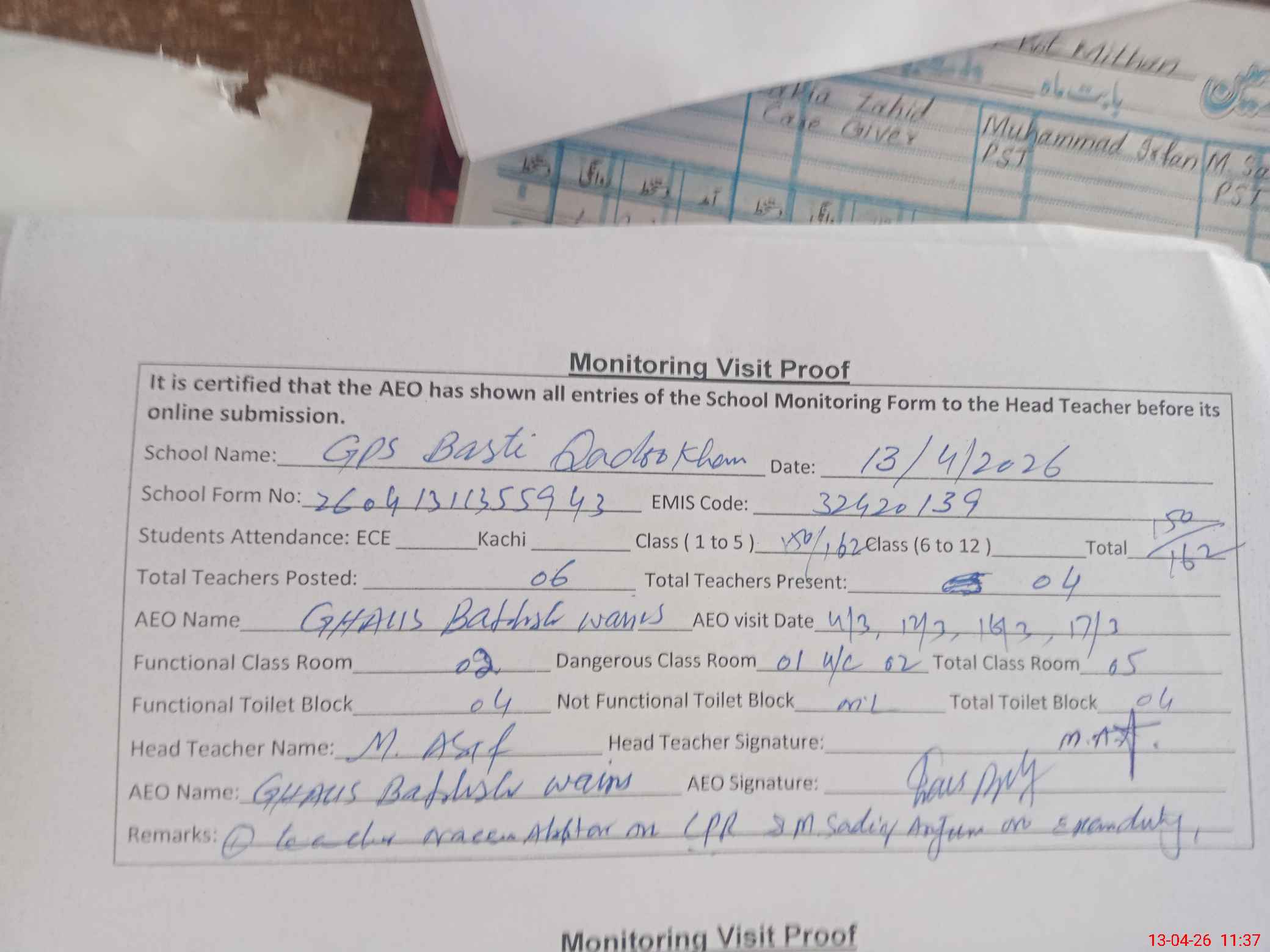 | EMIS Code: 32420139 | Name of School: GPS BASTI QADOO KHAN | |||
