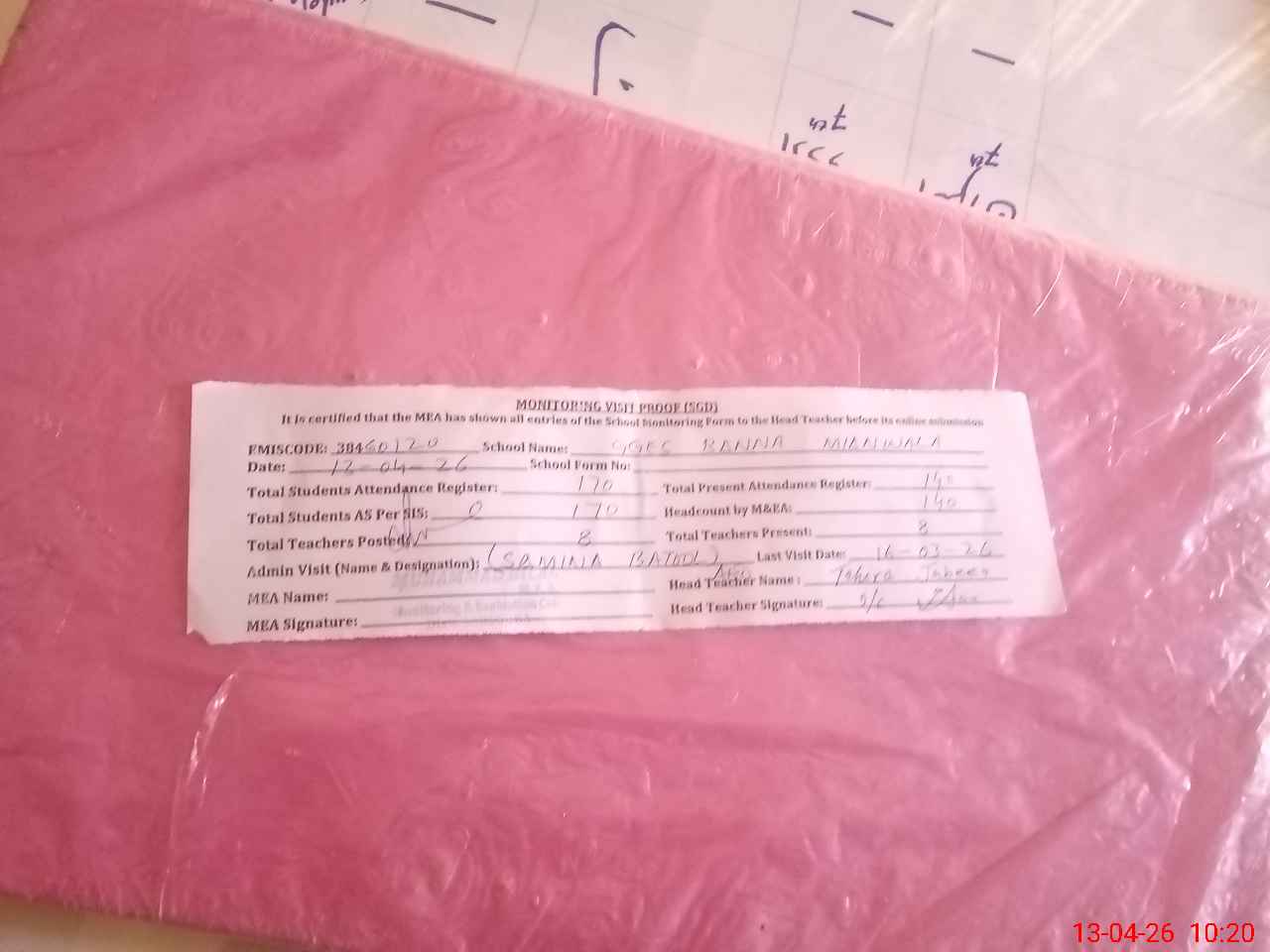 | Attendance Register | Head Teacher | MEA with School | Visit Proof |