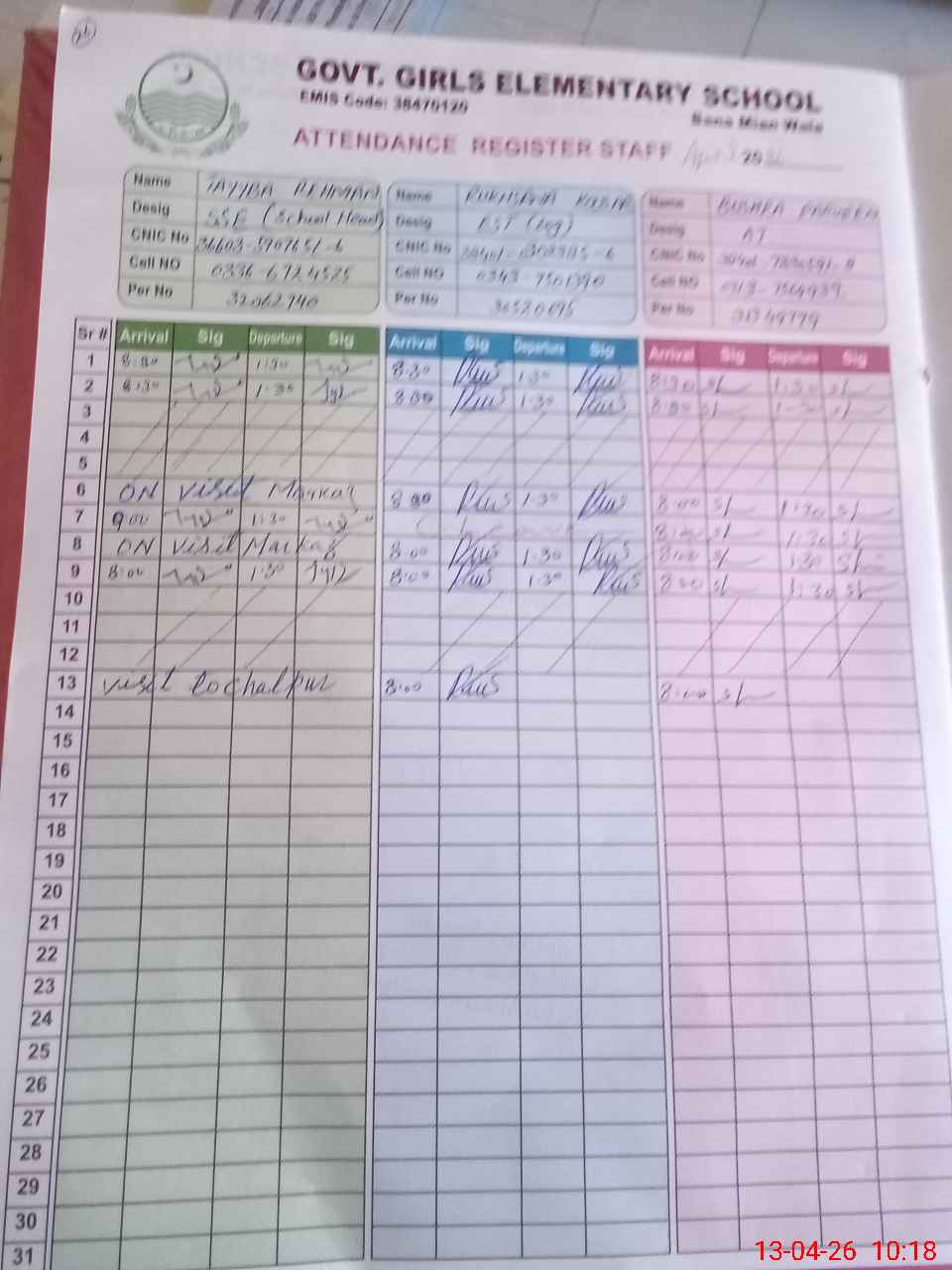 | CNIC | Full Name | Designation | R/C | Absence during last cal. month |