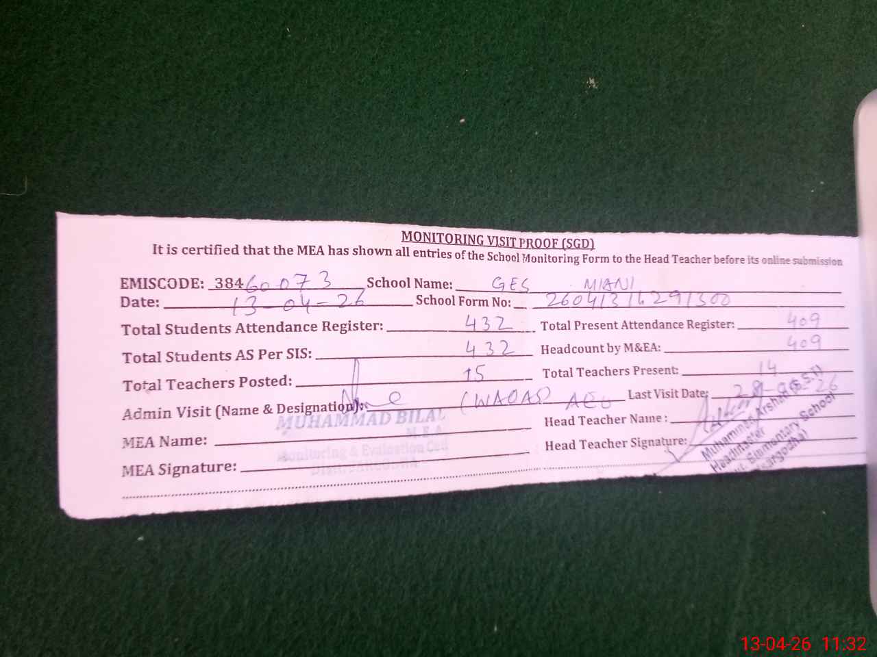 | Attendance Register | Head Teacher | MEA with School | Visit Proof |
