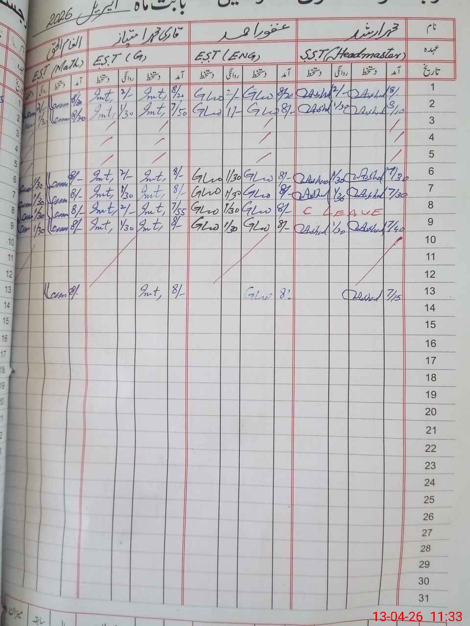 | Leave | Duty | Absent | Maternity | Medical | Ex- Pak |