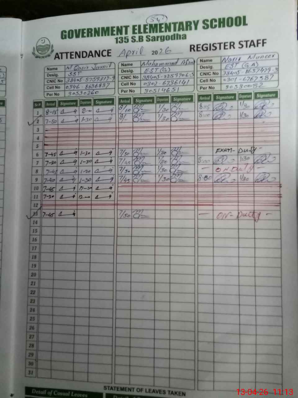 | CNIC | Full Name | Designation | R/C | Absence During Last Calender Month |