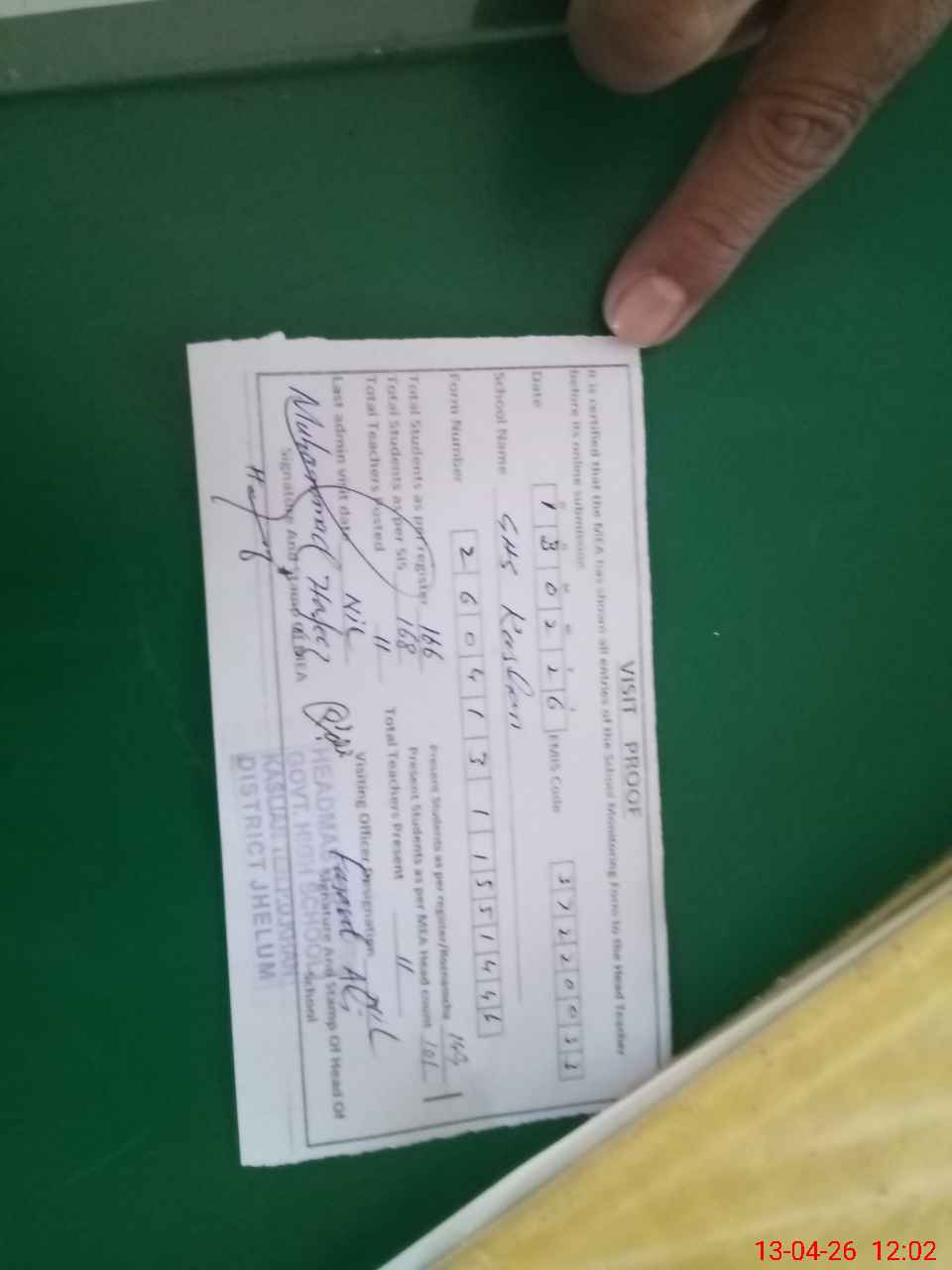 | Attendance Register | Head Teacher | MEA with School | Visit Proof |