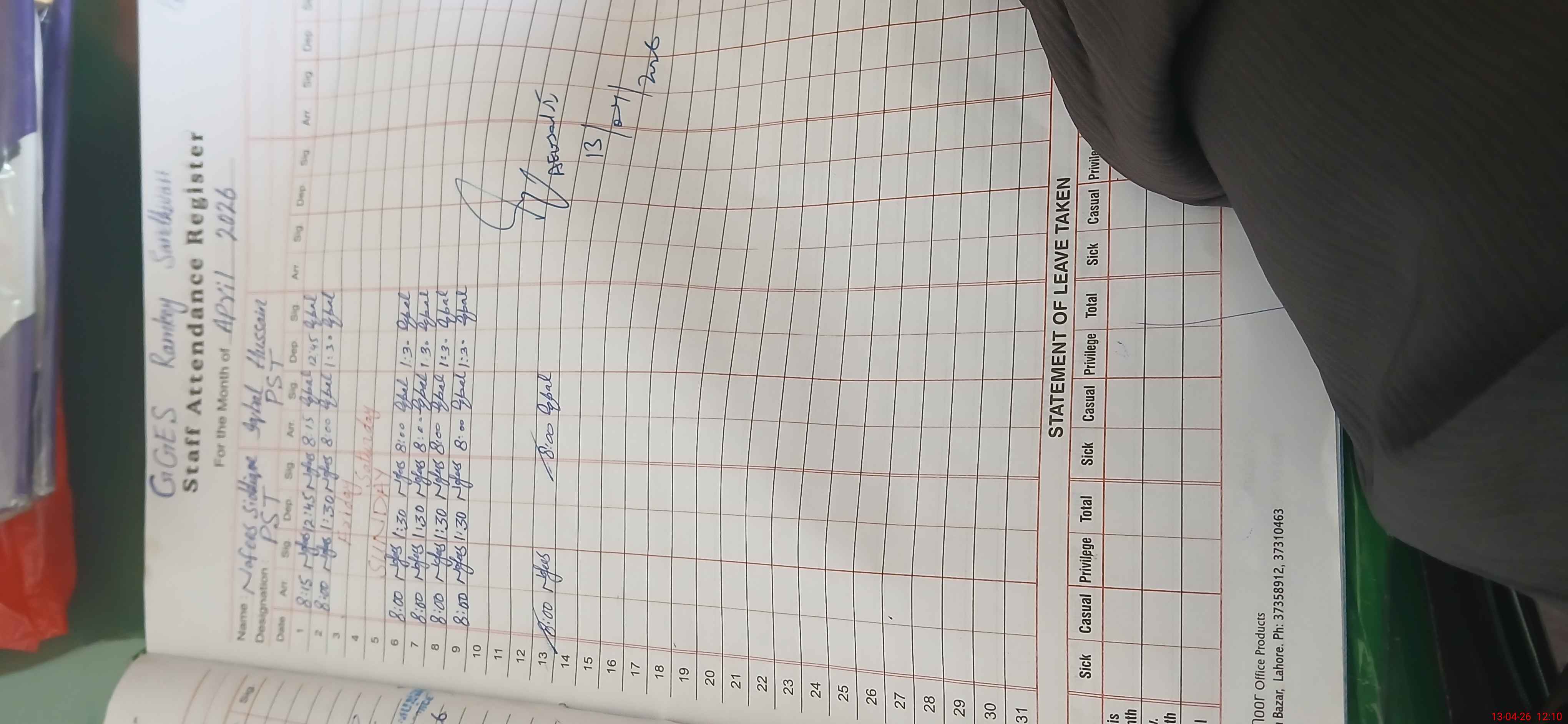 | CNIC | Full Name | Designation | R/C | Absence During Last Calender Month |