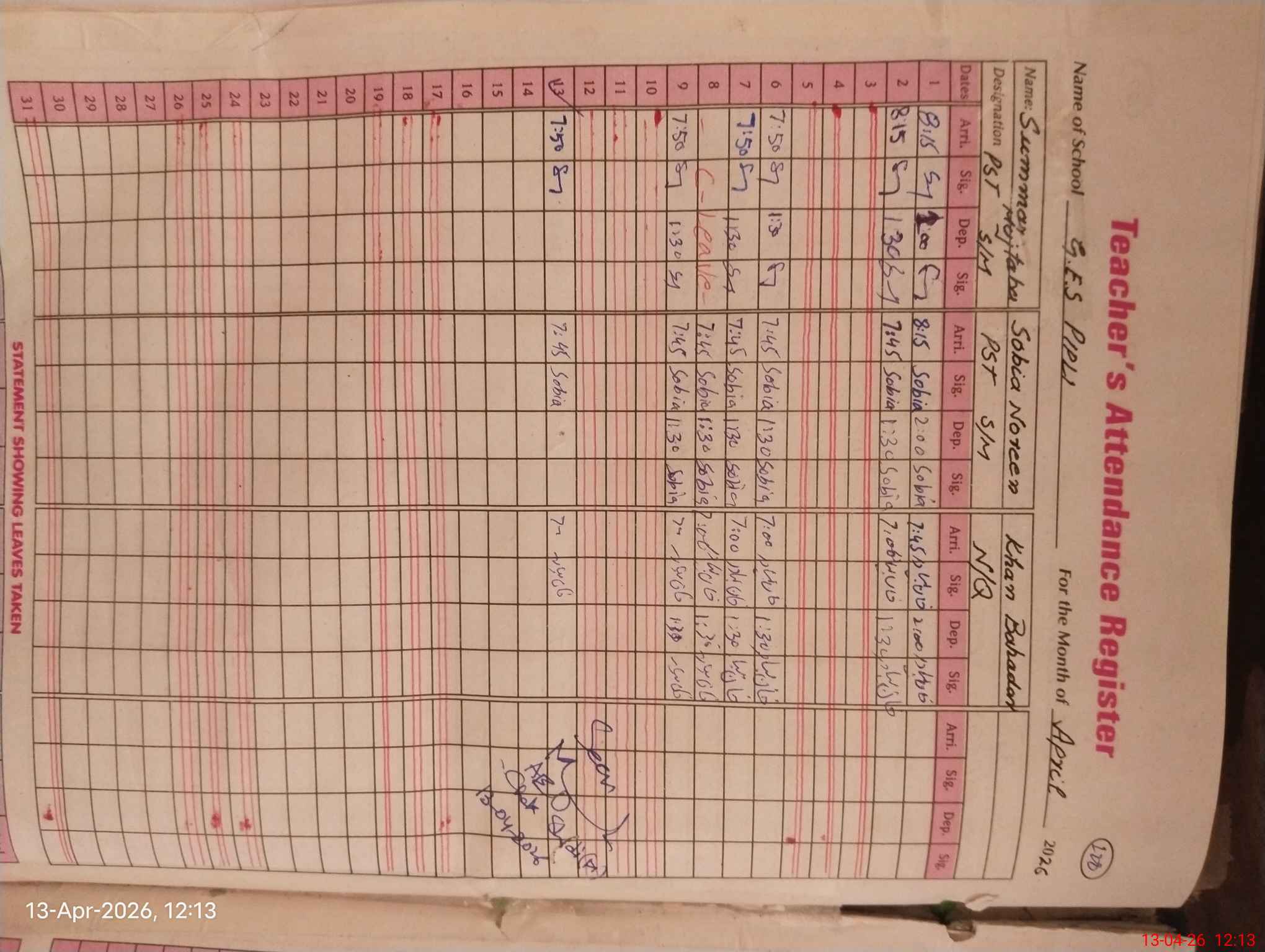 | 37**** | Ni**** Ma**** | EST Urdu | Regular | 0 | 0 | 0 | 0 | 0 | 0 | 0 | 0 | 0 | Exam Duty |