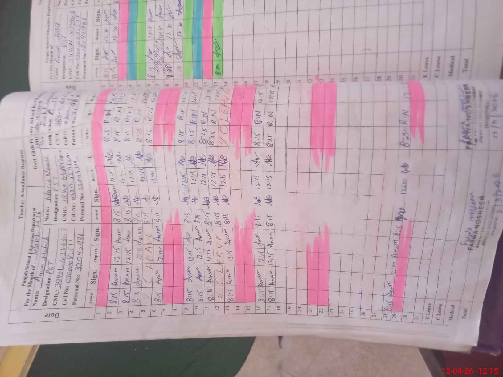 | Name: AN**** HA**** Designation: (School Headmaster's/Headmistress's) PST Phone/Cell Number: 03**** |