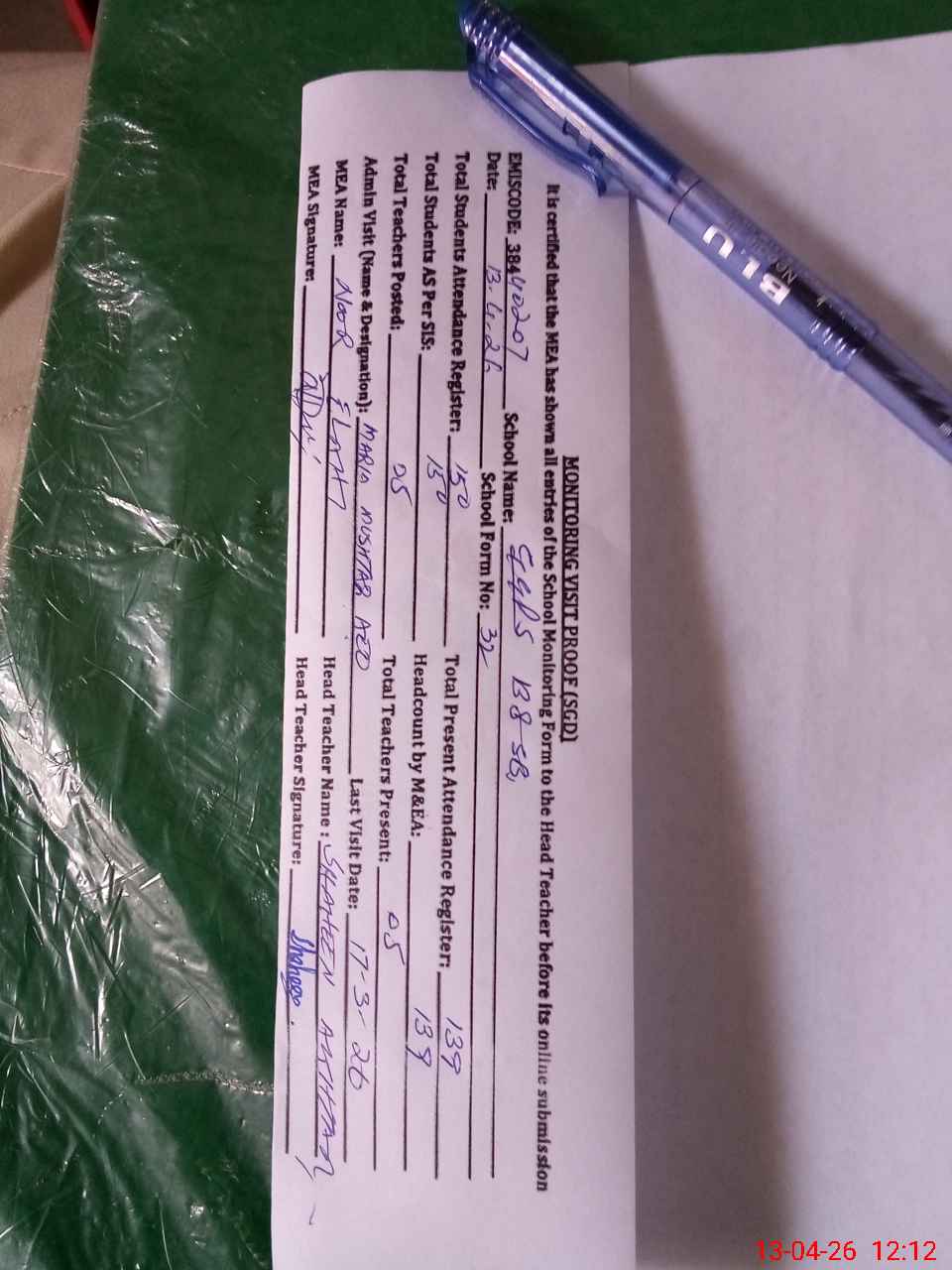 | Attendance Register | Head Teacher | MEA with School | Visit Proof |