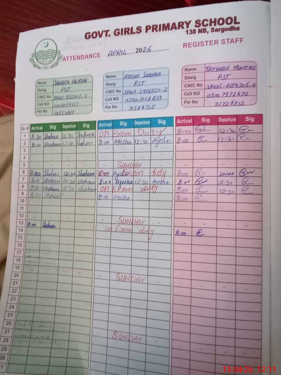 | 34**** | Mi**** Ka**** | PST Science/Maths | Regular | 0 | 12 | 0 | 0 | 0 | 0 | 0 | 0 | 0 | Exam Duty |