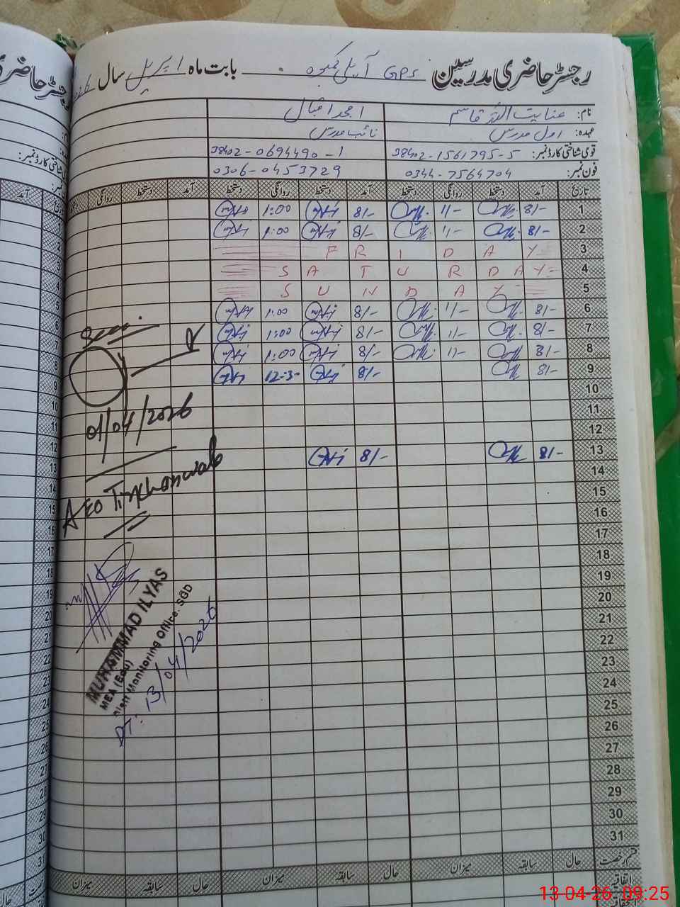 | Name: AN**** QA**** Designation: (School Headmaster's/Headmistress's) PST Phone/Cell Number: 03**** |
