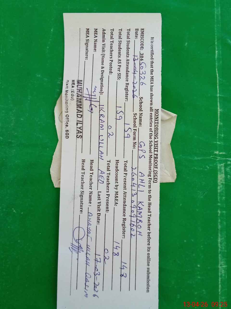 | Attendance Register | Head Teacher | MEA with School | Visit Proof |