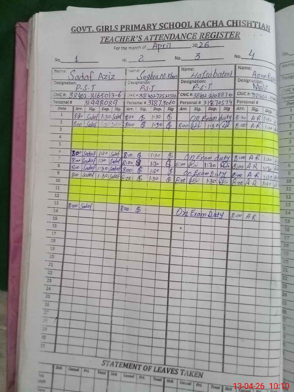| 38**** | Ha**** Ba**** | PST Arts | Regular | 0 | 0 | 0 | 0 | 0 | 0 | 0 | 0 | 0 | Exam Duty |