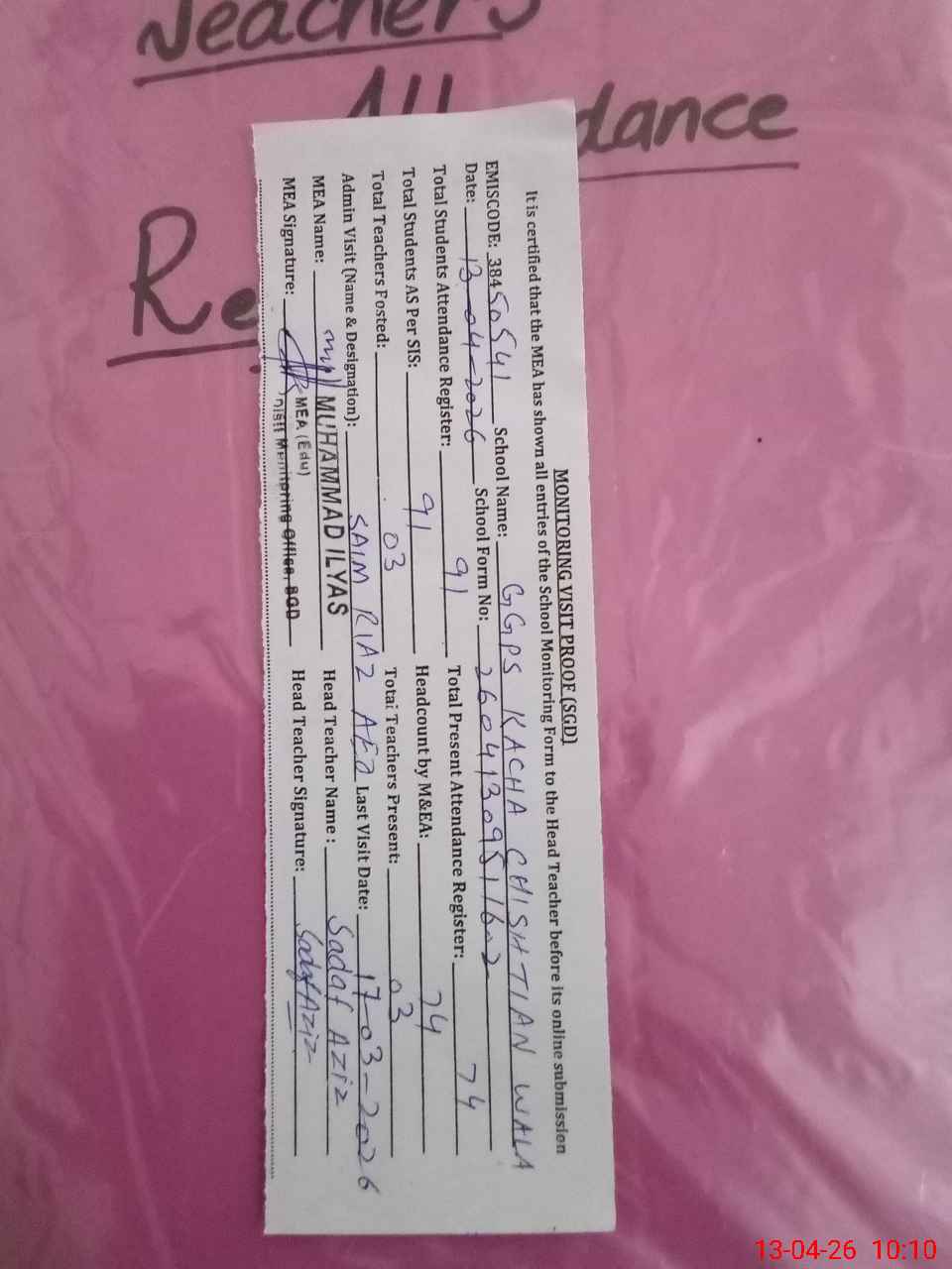| Attendance Register | Head Teacher | MEA with School | Visit Proof |