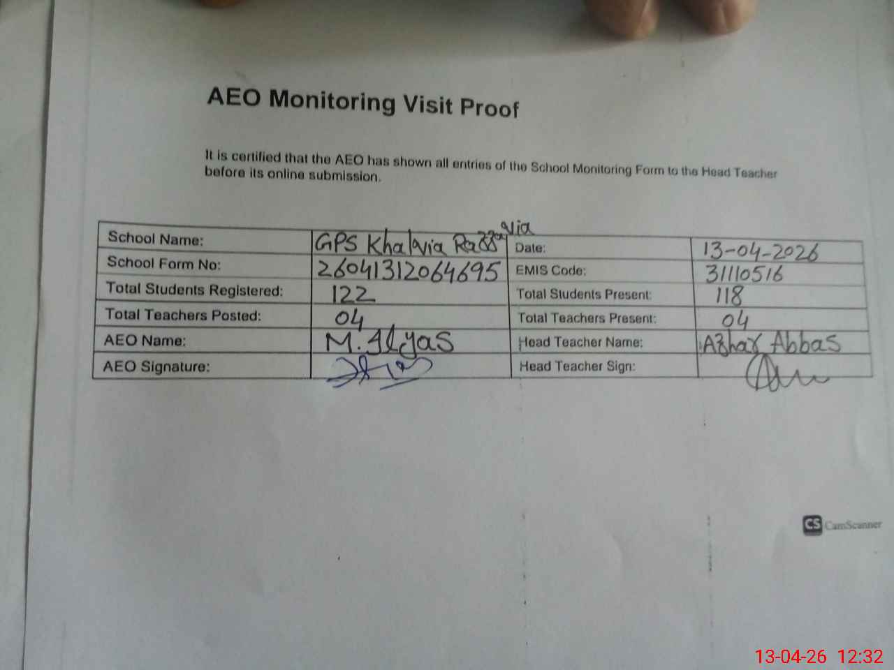 | Attendance Register | Head Teacher | MEA with School | Visit Proof |