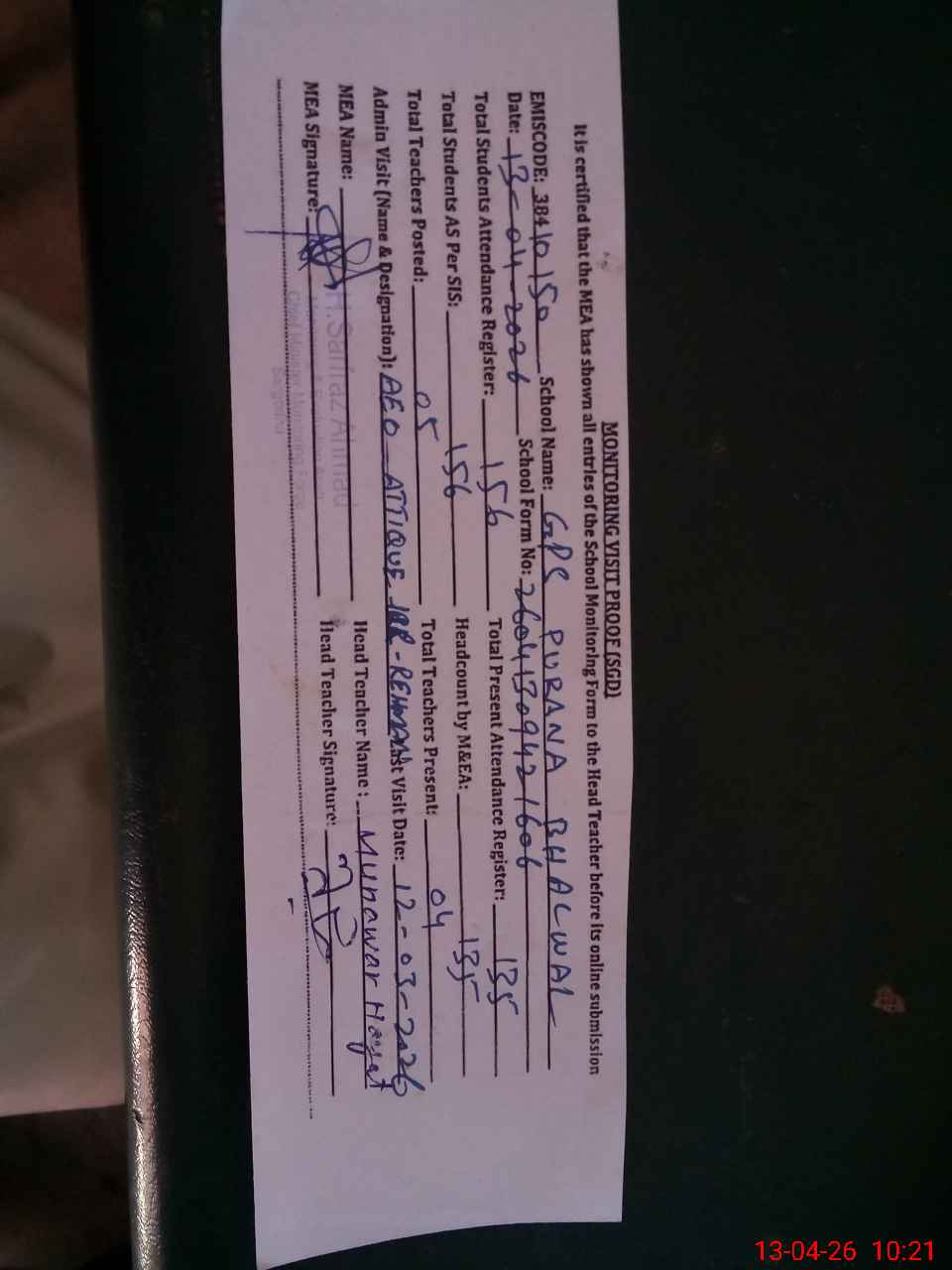 | Attendance Register | Head Teacher | MEA with School | Visit Proof |