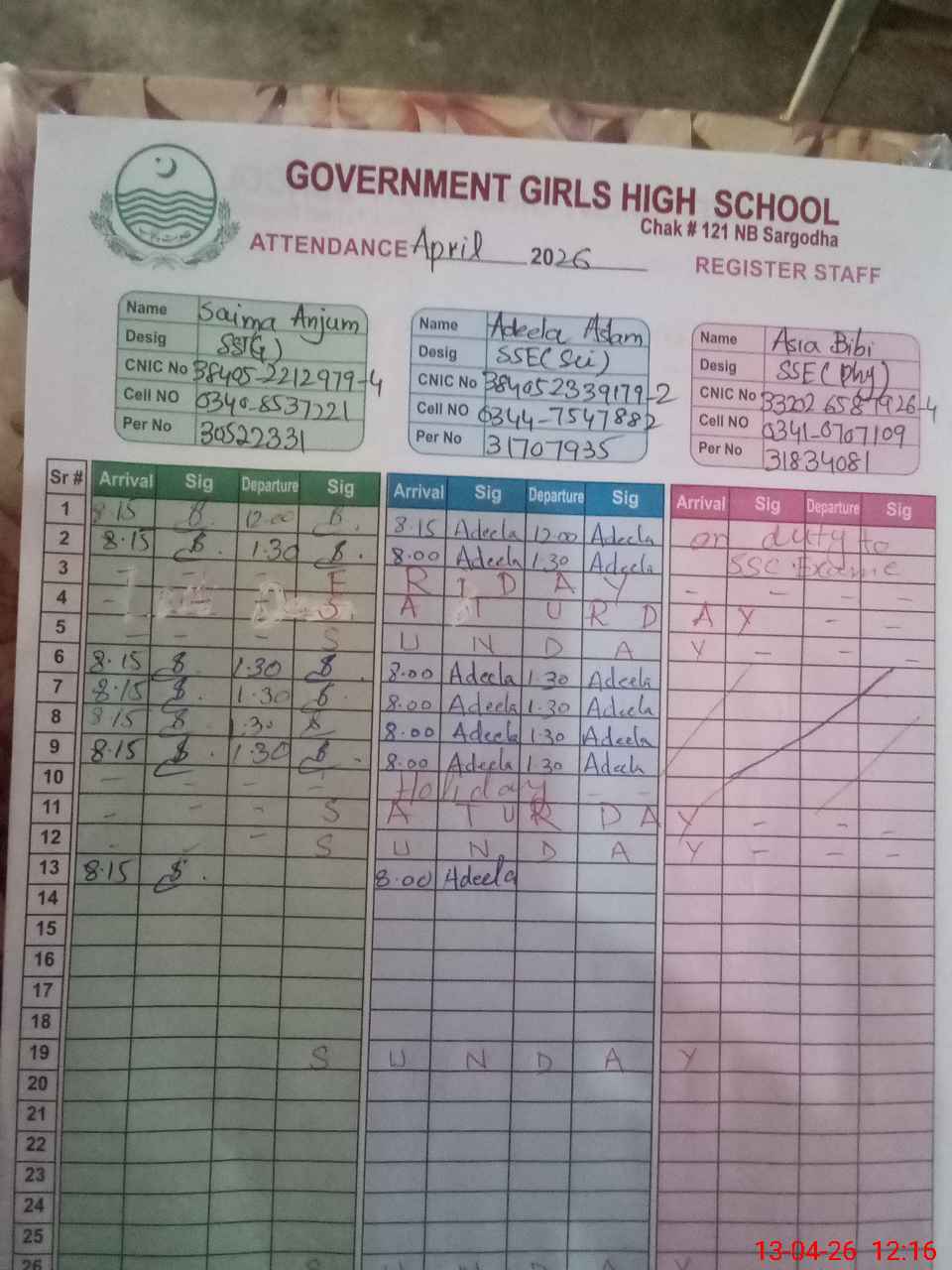 | Name: SA**** AN**** Designation: (School Headmaster's/Headmistress's) SST Phone/Cell Number: 03**** |