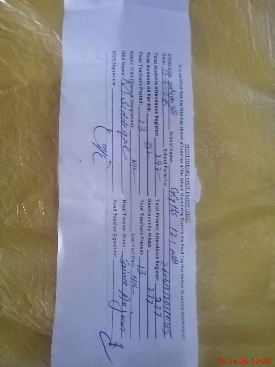 | Attendance Register | Head Teacher | MEA with School | Visit Proof |