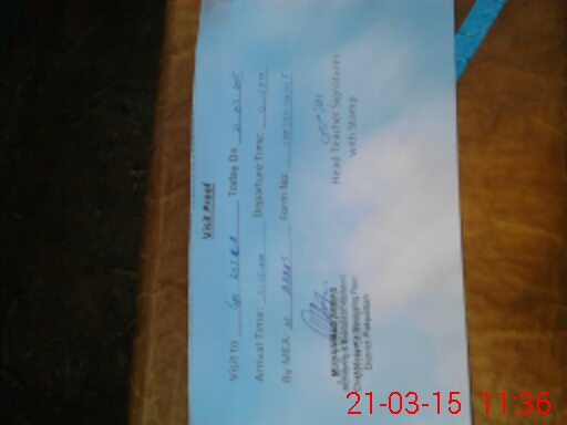 | School Visited by School Health & Nutrition Supervisor (No. of Visits) | 1 | Name1: | MUSHTAQ AHMED | Name2: | NIL |