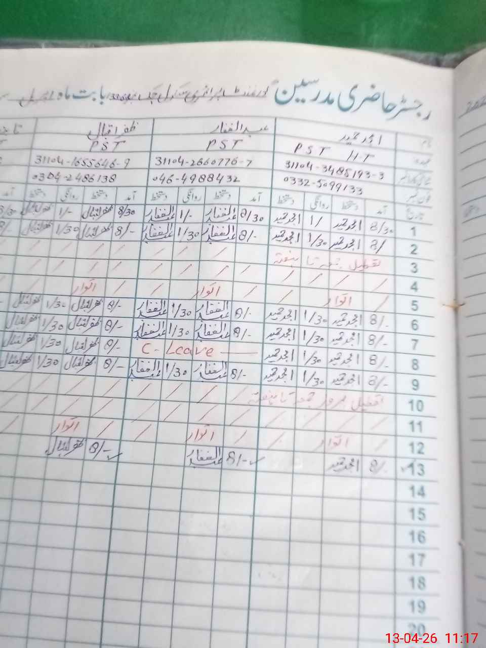 | CNIC | Full Name | Designation | R/C | Absence During Last Calender Month |