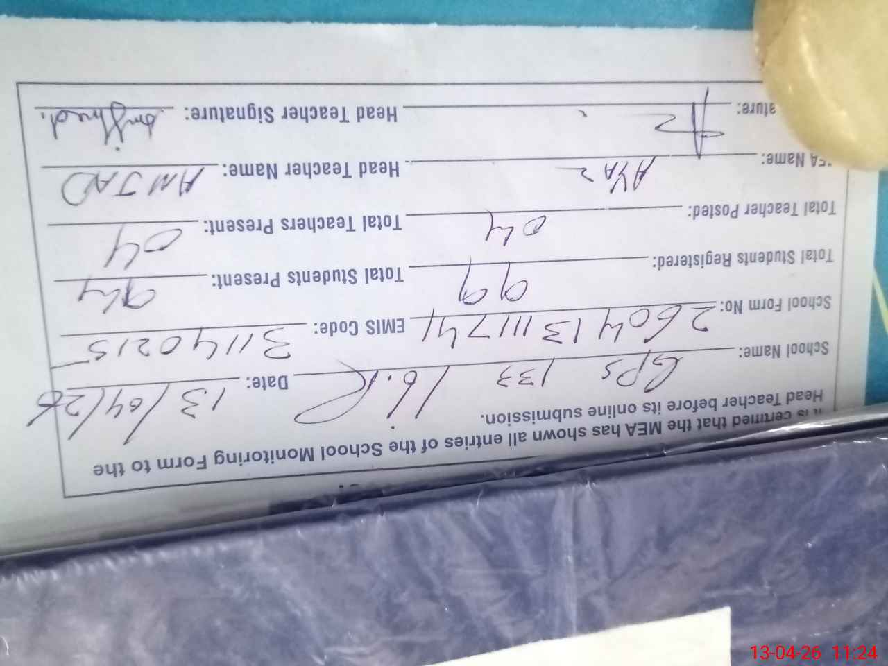 | Attendance Register | Head Teacher | MEA with School | Visit Proof |