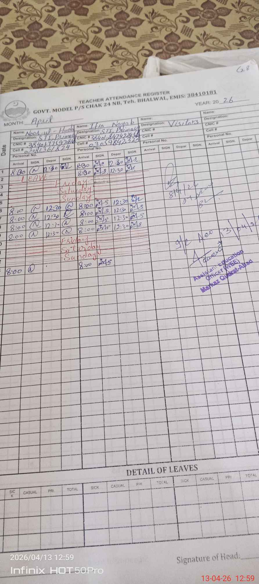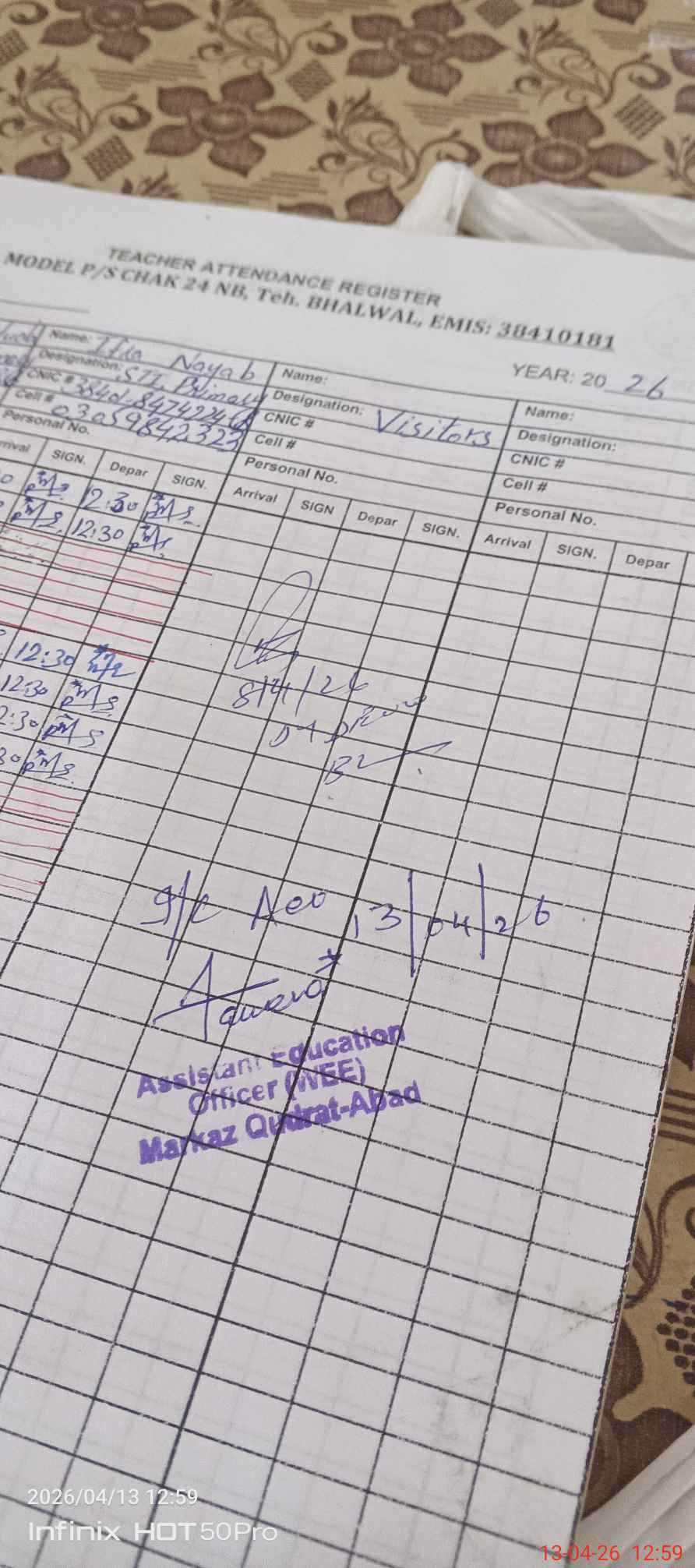| Name: SH**** MA**** Designation: (School Headmaster's/Headmistress's) PST Phone/Cell Number: 03**** |