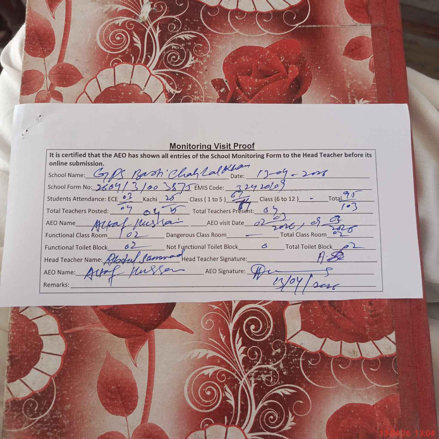 | Attendance Register | Head Teacher | MEA with School | Visit Proof |