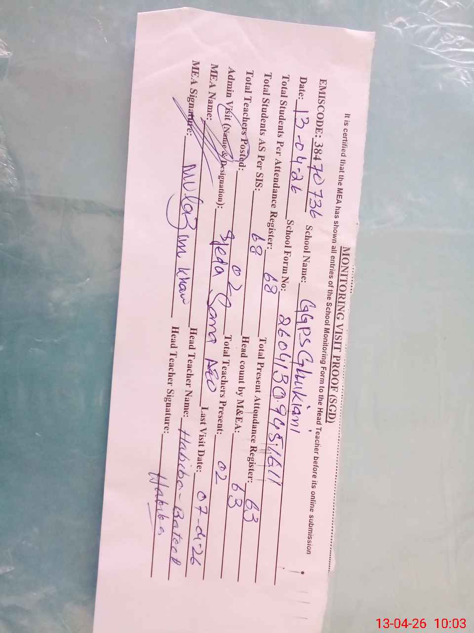 | Attendance Register | Head Teacher | MEA with School | Visit Proof |