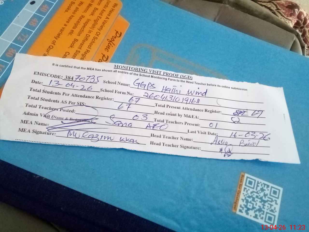 | Attendance Register | Head Teacher | MEA with School | Visit Proof |