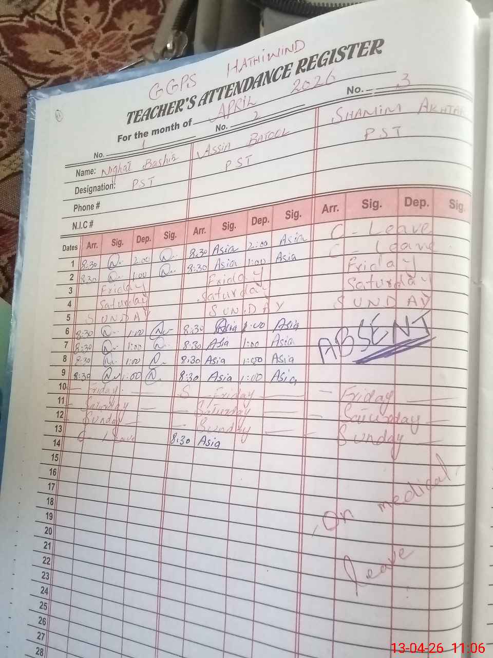 | CNIC | Full Name | Designation | R/C | Absence During Last Calender Month |