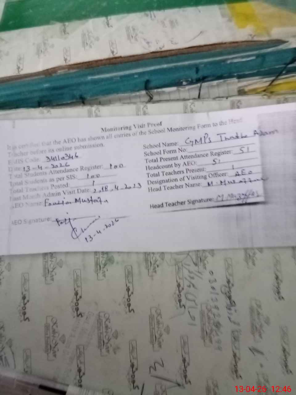 | Attendance Register | Head Teacher | MEA with School | Visit Proof |