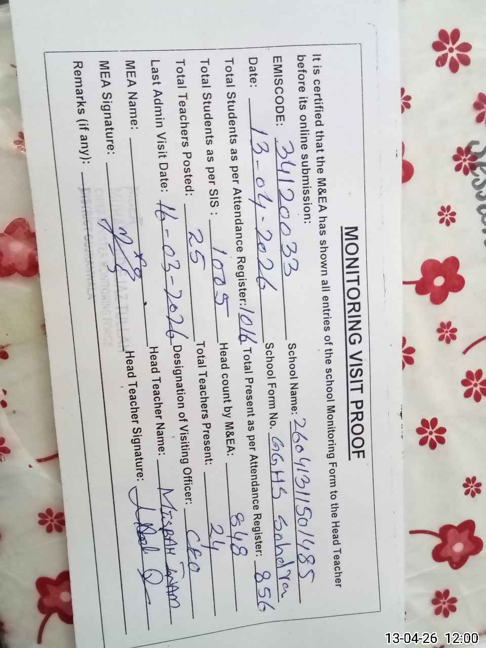 | Certified that this School was Inspected by the Undersigned MEA/DMO Today and the Information Stated Above is as Per Record. | |||||